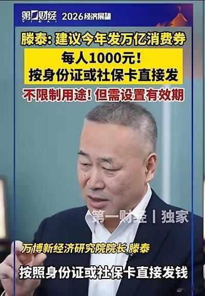 说实话的专家来了, 专家腾泰建议年内给每个人发1000元消费券,通过技术手段发放