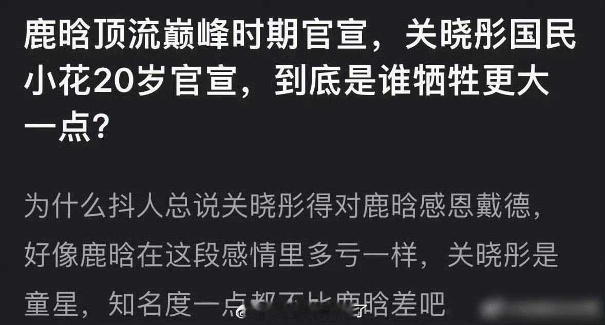 鹿晗和关晓彤俩人也是互相暗戳戳打舆论战了。鹿晗这边暗戳戳说flop和公开恋情有关;关晓彤这边暗戳戳说谁的七年不是七年。真这么不体面的话,支持两边实名对线鹿晗顶流巅峰时期官宣,关晓彤国民小花20岁官宣,大家感觉谁牺牲更大一点?