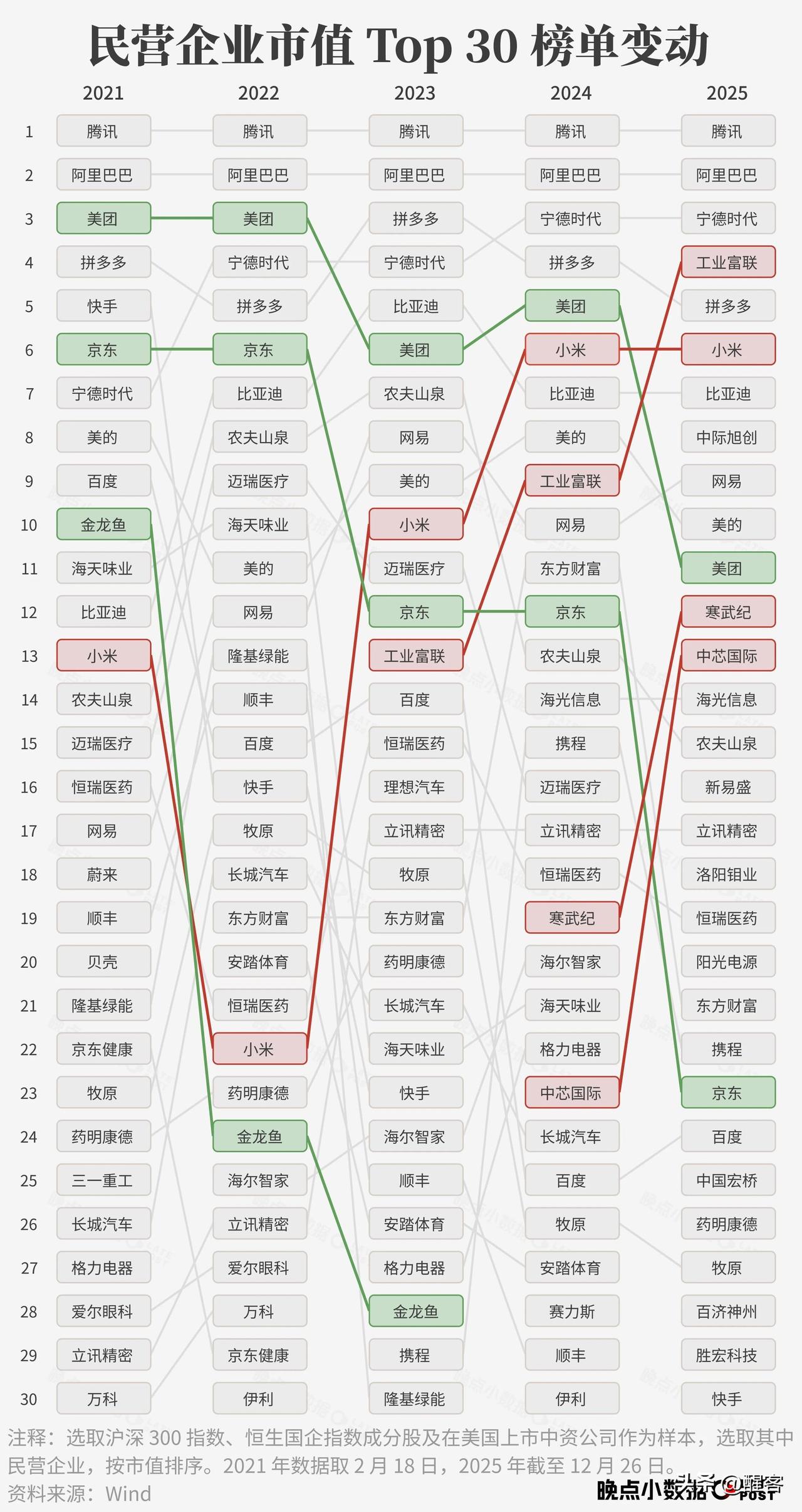 中国民营企业市值TOP30强2021-2025年变化情况。虽然腾讯、阿里等互联网企业海外上市市值纷纷遭遇了腰斩,市值远不如前,但是仍然领衔中国民营企业市值榜。而2024-2025年随着A股科技行情带动的上涨,寒武纪、工业富联、中芯国际等大步向前。