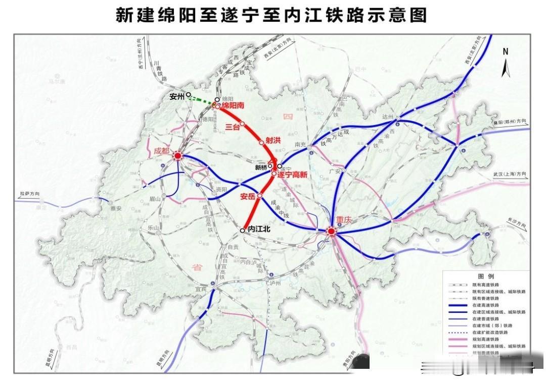 好消息!时速250公里!绵遂内铁路建设再次提速,二期工程遂宁至内江段正式进入环评阶段,标志着这条连接川东四市的交通大动脉向着全面开工迈出关键一步。 作为成渝地区双城经济圈的重要加密线路,该项目正线长约107.8公里,自遂宁经开区内引出,经安居区、船山区,进入资阳安岳县,最终抵达内江东兴区与高新区,全程采用双线设计,速度目标值定为250公里/小时。线路规划设立四座车站,为沿线城镇之间的快速联系变得更加快捷。 据悉,绵遂内铁路整体线路贯穿四川东部,北起绵阳,向南串联遂宁、资阳(安岳县),终至内江,正线总长约310.19公里,并配有联络线约71.87公里,全线设计时速统一为250公里。项目总投资预估算约603.21亿元,是近年来四川省高铁网络建设的重点工程之一。 此次进入环评的遂宁至内江段,作为全线的二期工程,前期规划论证正在加速推进。该段建成后,将填补区域内直达高速铁路的空白,大幅缩短遂宁、安岳与内江之间的时空距离。乘客未来可凭借这条线路,在不到一小时的时间内穿梭于沿线主要城市之间,极大提升出行效率。 从长远布局来看,绵遂内铁路不仅是川东城市群互联互通的重要载体,也是对接成渝主轴、促进双城经济圈协同发展的关键基础设施。眼下,遂宁至内江段的环评工作正有序展开,后续将逐步推进用地审批、工程招标等环节。整条铁路的建成,将显著完善四川高铁“内循环”,并进一步衔接国家“八纵八横”高铁网,为川中川东地区带来更广阔的发展机遇,值得期待!