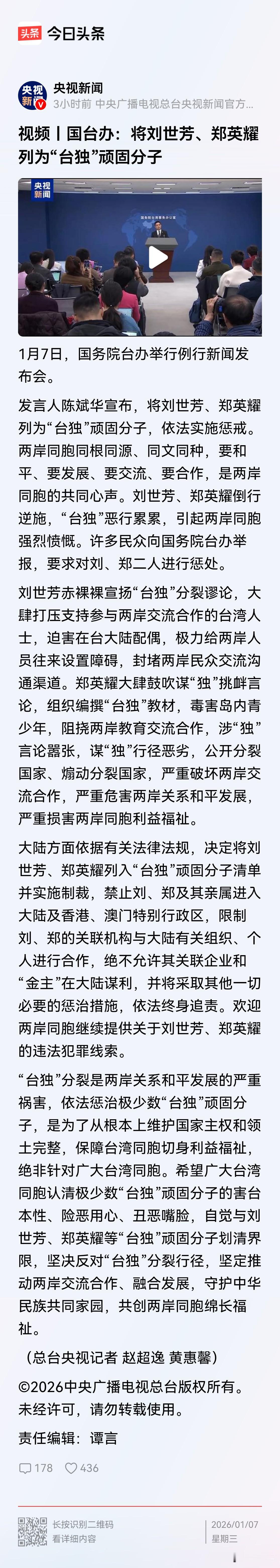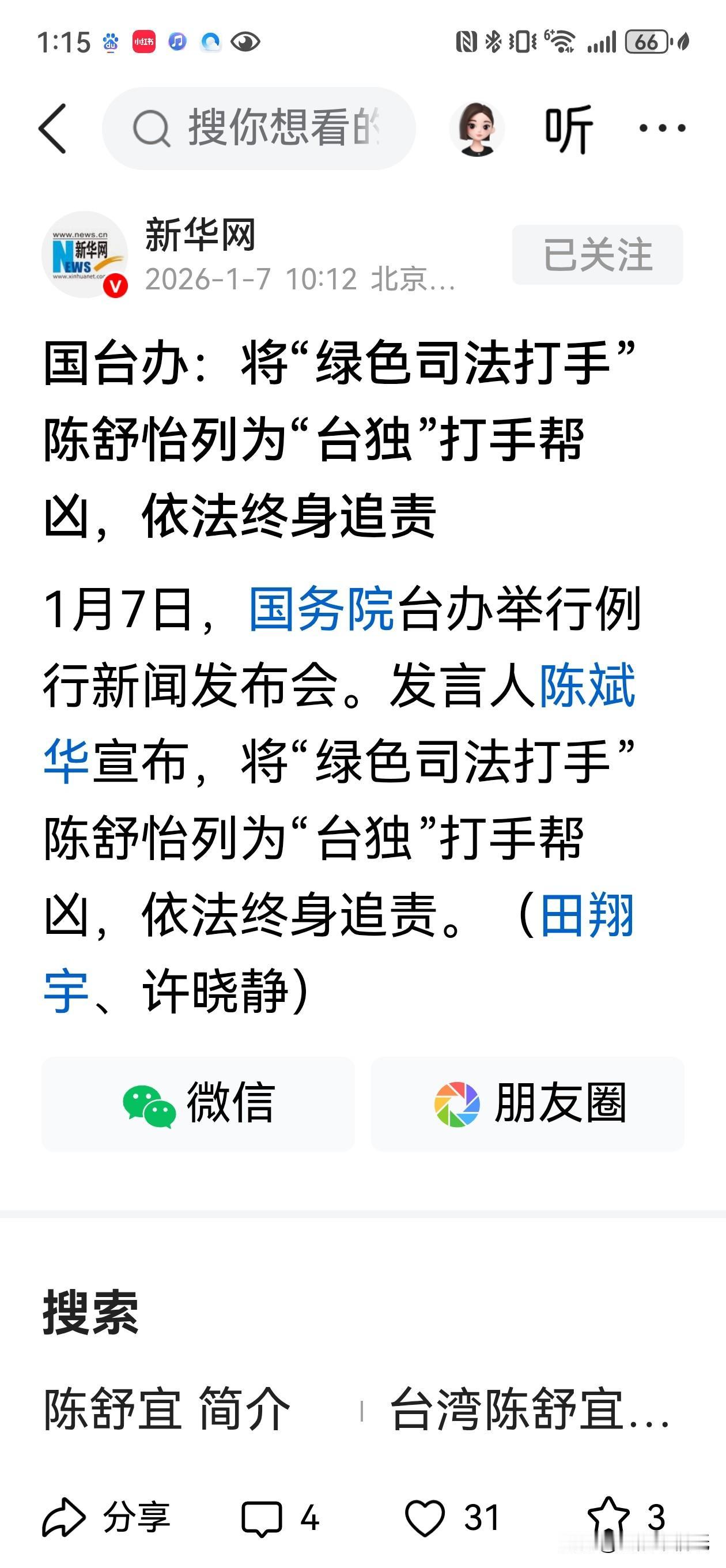 请大家记住这三副丑恶的嘴脸!这3人就是刚刚被列为“台独”顽固分子的刘世芳、郑英辉,“台独”打手帮凶陈舒怡! 刘世芳,民进党“内政部长”,两面人!既是“台独”顽固分子,又是“打手帮凶”——史上唯一双榜在列者,公然辱骂两岸交流者,煽动对立,罪证确凿。 郑英耀,教育部门负责人,文化洗脑手!自去年3月起,与刘世芳合演“一边一国”双簧,毒化校园思想,抹黑统一共识,把讲台变成分裂讲坛。 陈舒怡,检察官,司法之耻!披着法律外衣,炮制“绿色恐怖”冤案,迫害支持两岸融合的台湾同胞,用公权力实施政治迫害,比暴徒更阴毒。 他们不是政客,是分裂的工具;不是公职,是国家的蛀虫。 大陆已亮剑:终身追责,无处可逃。14名顽固分子,12名打手帮凶,名单还在延长。法律之网,早已织就;正义之锤,从不缺席。 这三人,只是开始。 下一个,会是谁? 刘世芳(图1)、郑英耀(图2)、陈舒怡(图3) 台独妖孽