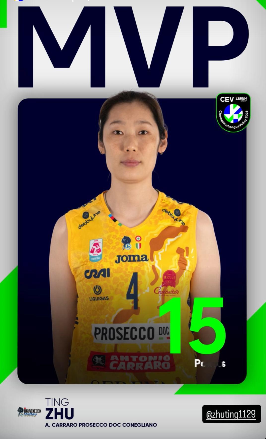 欧冠小组赛,朱婷拿到最高的15分,并当选MVP!朱婷