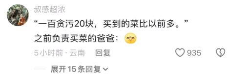 一百贪污20块,买到的菜比以前多。之前负责买菜的爸爸: