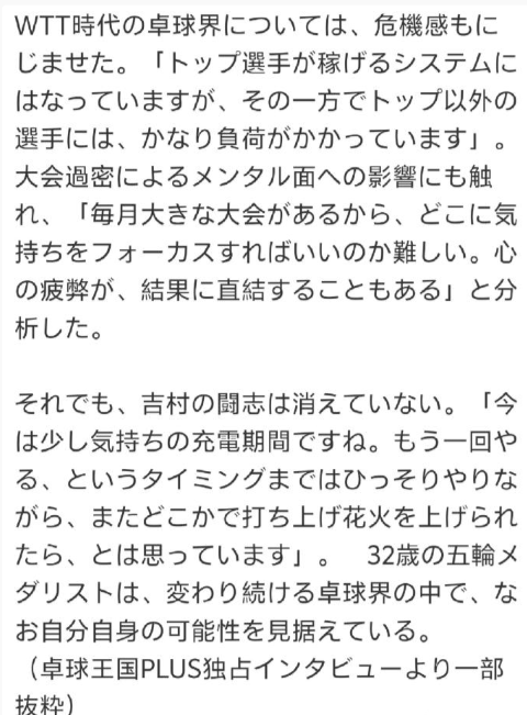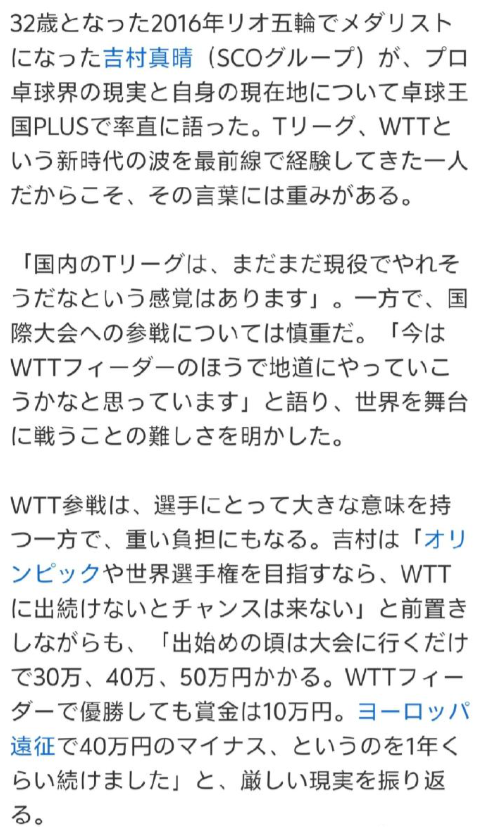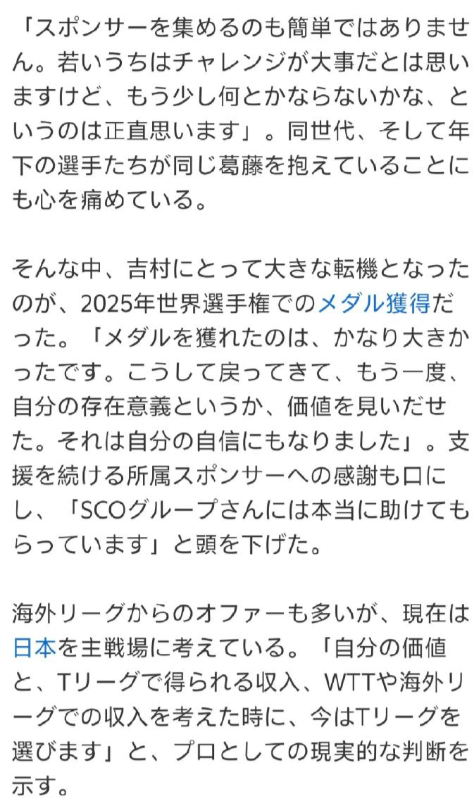 吉村真晴:现在WTT的体系能让顶级选手赚到钱,但对于非顶级的选手来说,负担相当沉重。赛事的密集让人很难把握应该把重心放在哪里。现在算是充电期吧,我会精心等待,期待再次绽放绚丽的烟花! “能在2025年世乒赛斩获奖牌,这对我意义非凡。正是此番回归赛场,我才重新找到了自身的存在意义与价值。” 如今在T联赛的琉球队,吉村真晴同样作为核心球员引领着队伍前行。 32岁的吉村真晴(SCO集团所属),曾是2016年里约奥运会奖牌得主。近日他在《桌球王国PLUS》中,率直袒露了自己在职业乒坛的现状与处境。作为亲身经历了T联赛、WTT等新时代乒坛浪潮的先锋人物,他的每一句言辞都分量十足。 “在国内的T联赛,我仍感觉自己完全有能力继续征战赛场。” 但另一方面,对于出战国际赛事,他的态度则十分谨慎。“目前我打算先从WTT支线赛做起,一步一个脚印地慢慢来。” 言语间,他道出了征战世界赛场的重重艰难。 参加WTT赛事,对选手而言意义重大,却也伴随着沉重的负担。吉村坦言:“如果目标是奥运会、世乒赛这类大赛,就必须持续征战WTT赛事,否则根本无缘获得参赛机会。” 话锋一转,他又回忆起那段艰难的过往:“刚起步的时候,单是参加一次比赛就要花费30万(1.3万人民币)、40万甚至50万日元(2.2万)。就算拿下WTT支线赛的冠军,奖金也只有10万(4400元人民币)日元。去欧洲参赛的那一年,几乎每次远征都要亏40万日元(1.78万人民币)左右。” “想要拉到赞助商,也绝非易事。我当然明白年轻时就该勇于挑战,但说实话,我也常常会想,难道就没有别的办法了吗?” 想到同代乃至后辈选手们都面临着同样的困境,他也满心怅然。 而在这段低谷岁月中,2025年世乒赛的夺牌经历,成了吉村职业生涯的重要转折点。“能拿到这块奖牌,真的太重要了。正是这次重返赛场,我才重新找到了自己的存在意义与价值,这也为我增添了莫大的自信。” 他还不忘向一直支持自己的所属赞助商表达谢意,恳切说道:“真的非常感谢SCO集团给予我的帮助。” 尽管收到了不少海外联赛的邀约,但吉村目前仍将主战场放在日本。“综合考量自身价值、T联赛的收入,以及征战WTT和海外联赛的收益后,我最终选择了留在T联赛。” 这番话尽显他作为职业选手的现实考量。
