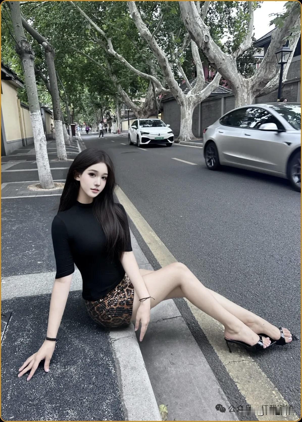 都市街拍,黑衣美女与复古车影交相辉映,尽显时尚与优雅。