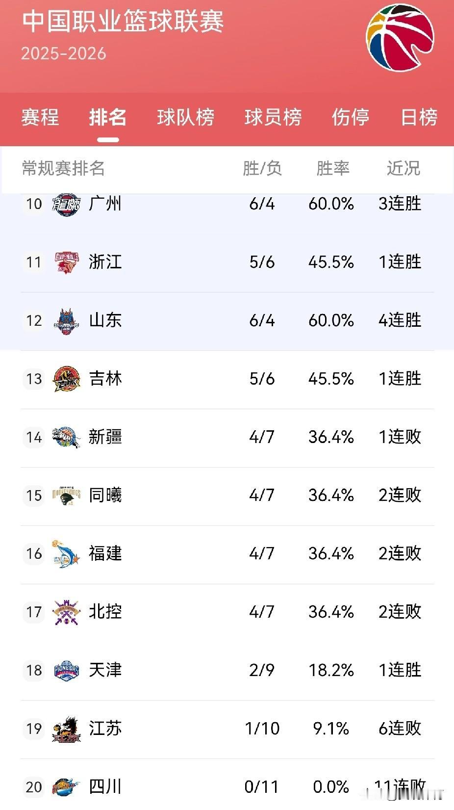 中国男子篮球职业联赛积分榜 上海八连胜,跃居积分榜第一, 广东和广厦名列第二第三。 四川依旧难求一胜。
