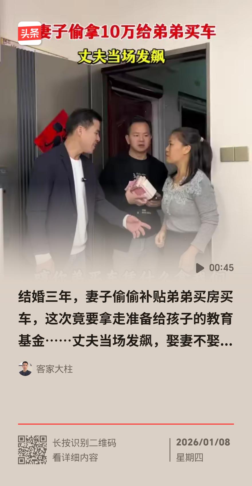 十万搬砖血汗钱被妻子贴补弟弟买车 他一把火烧了结婚照坚决离婚 辽宁一男子五年搬砖攒下十万块,本打算凑钱付首付买套房,让一家人告别出租屋,没成想这笔血汗钱竟被妻子偷偷转给弟弟买了新车。 这笔钱来得有多不容易?是男人顶着四十度高温,在工地一天干满十二个小时,手上磨破三层皮挣来的;是他连续几年春节舍不得买回家车票,蹲在工厂宿舍啃冷馒头省下来的。满心欢喜去查账的他,看到余额时当场手脚发颤。 面对质问,妻子先是支支吾吾,被问急了才理直气壮表示,弟弟谈婚论嫁女方要求买车,自己不帮衬婚事就黄了,还口口声声说“以后弟弟会还钱”。这句话彻底浇灭了男人的念想。 他没吵没闹,转身扯下墙上的结婚照,点上火苗,指着门哑声怒吼离婚。妻子收拾行李时还嘴硬,觉得离了婚自己也能过得好。 可回到娘家的她,日子并不好过。饭桌上最大的鸡腿被母亲夹给弟弟,弟弟开着新车带女友兜风,对她视而不见,还钱的事更是只字不提。当初的媒人见了她也绕道走。 这件事也警醒众人:亲情再深也要有边界,拎不清的帮扶,最终只会毁了自己的小家庭。和人交往,你看重的是人品还是金钱