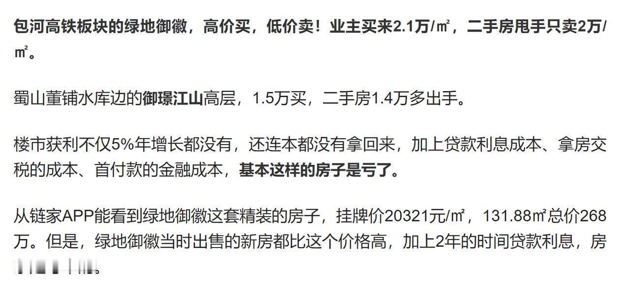 现在所有人都知道2021年是房地产的巅峰,其实在2020年就很多人知道情况会有变化了,那个时候就有不少人出了,当然那个时候就是亏点利息。 到了24-25年应该就连上了年纪的都知道房地产是啥样子了,但是这两年还是很多人去买,然后买到手来亏本卖,这个东西也是很神奇。 目前合肥这些刚交付的新房,中海悦府因为新计容,成交的两套,不咋亏,就亏2年利息,税费和交房的费用,但是这也二三十万了。其他都是要亏大几十万到一两百万起步。所以有钱人就是爱折腾。
