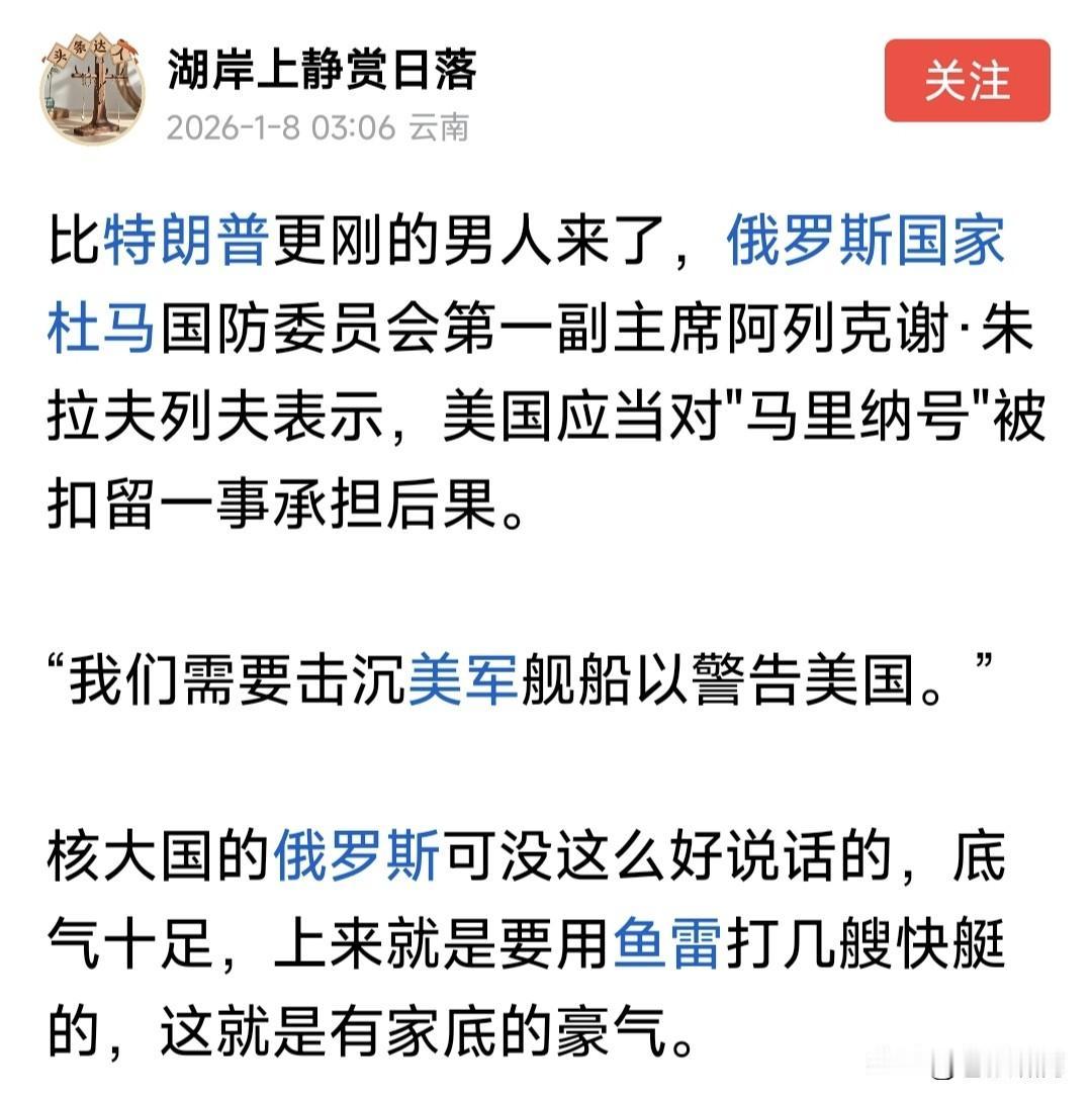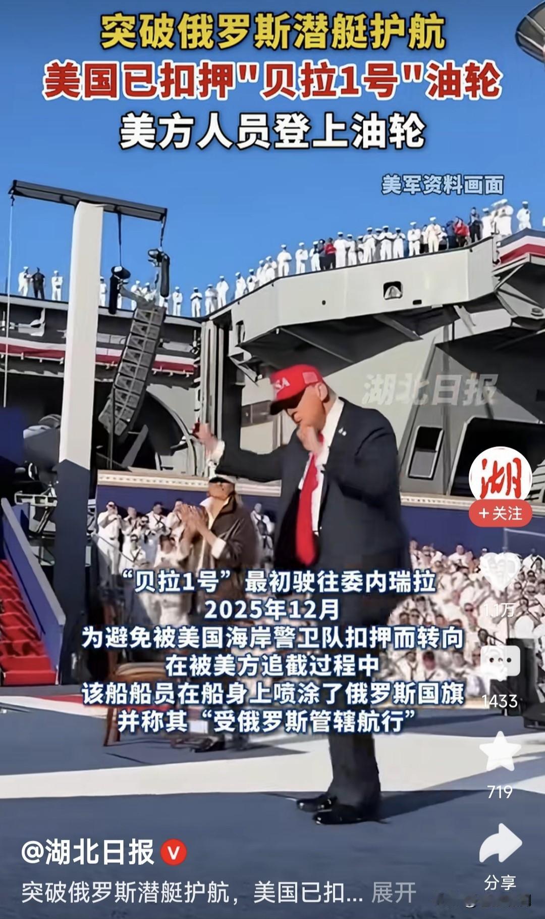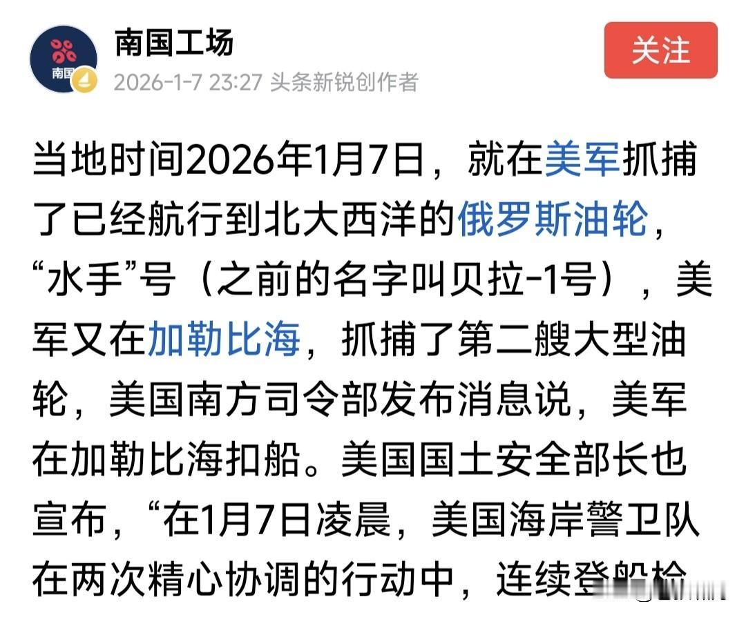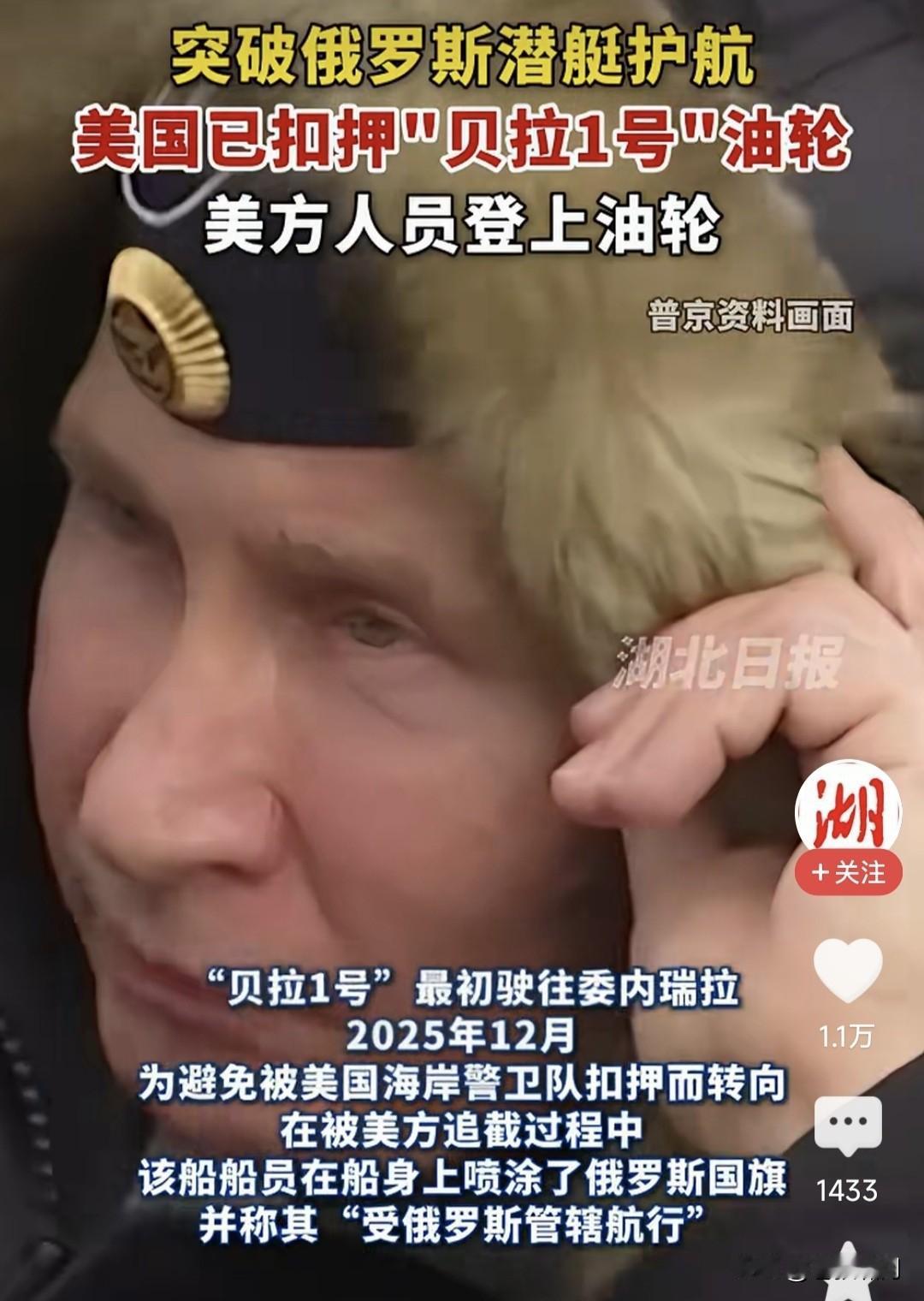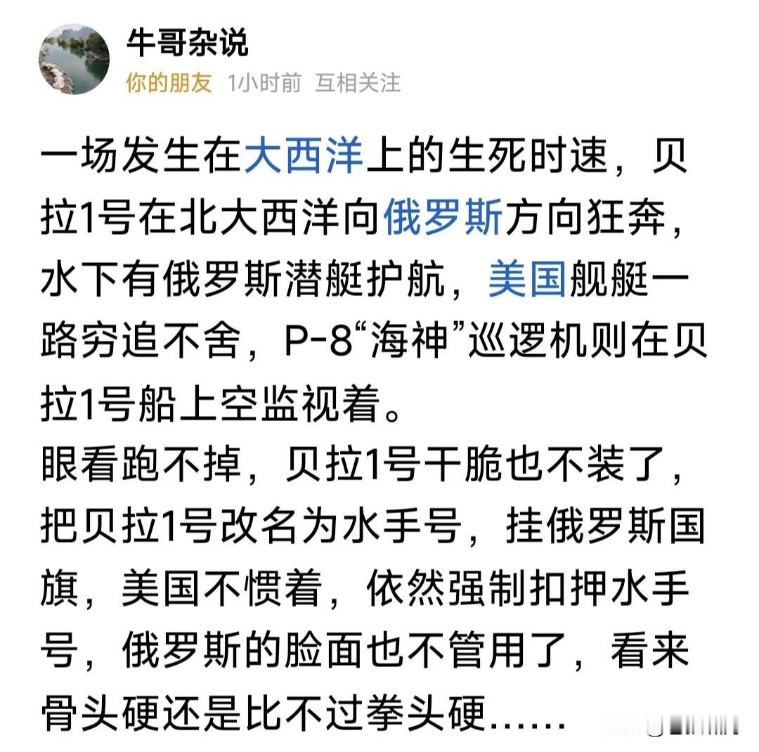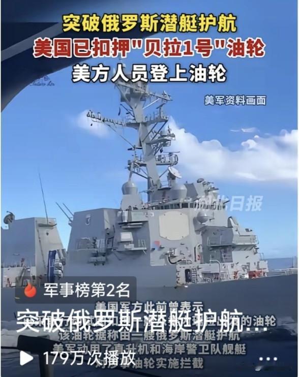 川普不看普皇脸色!坚持追逐“贝拉1号”18天,终于强行登船将其扣押。该船驶往委内瑞拉途中,被美军拦截要求检查,该船拒绝逃往大西洋。 途中向俄发出75次求救信号!俄急派潜艇靠近护航,警告美方不要登船扣押。该船干脆改名“水手号”,巴拿马旗换成俄旗,船身涂上俄国旗图案。 美军舰船不为所动,继续穷追不舍,终于在大西洋上追上该船。直升机临空,士兵强行登船,将油轮扣押!同时在加勒比海扣押一艘“索菲亚号”。 网曝这是美围堵委以来,公开扣押的第16艘油轮!看来是要堵死委卖油通道,扼杀其经济命脉,逼其投降? 俄杜马副主席朱拉夫列夫宣称:美国应当为扣押俄油轮承担后果!我们需要击沉美军舰艇,警告嚣张气焰! 问题是如何击沉?潜艇发射鱼雷吗?但俄潜艇敢吗?果真如此,部署欧洲美军会否反击?谁敢冒这个风险? 当下乌战僵持,川普力推停战!自愿联盟欲派兵入乌,俄遭多方围堵,如何破局火烧眉毛,还敢火上浇油? 川普似乎已对普皇失去耐心,不再对俄绥靖求和,开始勒紧绳索:恢复援乌,促成安保协议,封堵俄影子舰队,全力施压俄传统盟友伊委哥古等! 一切迹象表明,特朗普对俄乌态度,已经发生改变!与欧乌形成默契,要逼俄方就范同意停战。如果不同意,将加大援乌力度,看谁首先挺不住? 识时务者为俊杰,通机变者为英豪!聪明反被聪明误,解铃还须系铃人!还是适时停战吧!不然如此耗下去,结果真的难说。现在停战对谁都好! …………