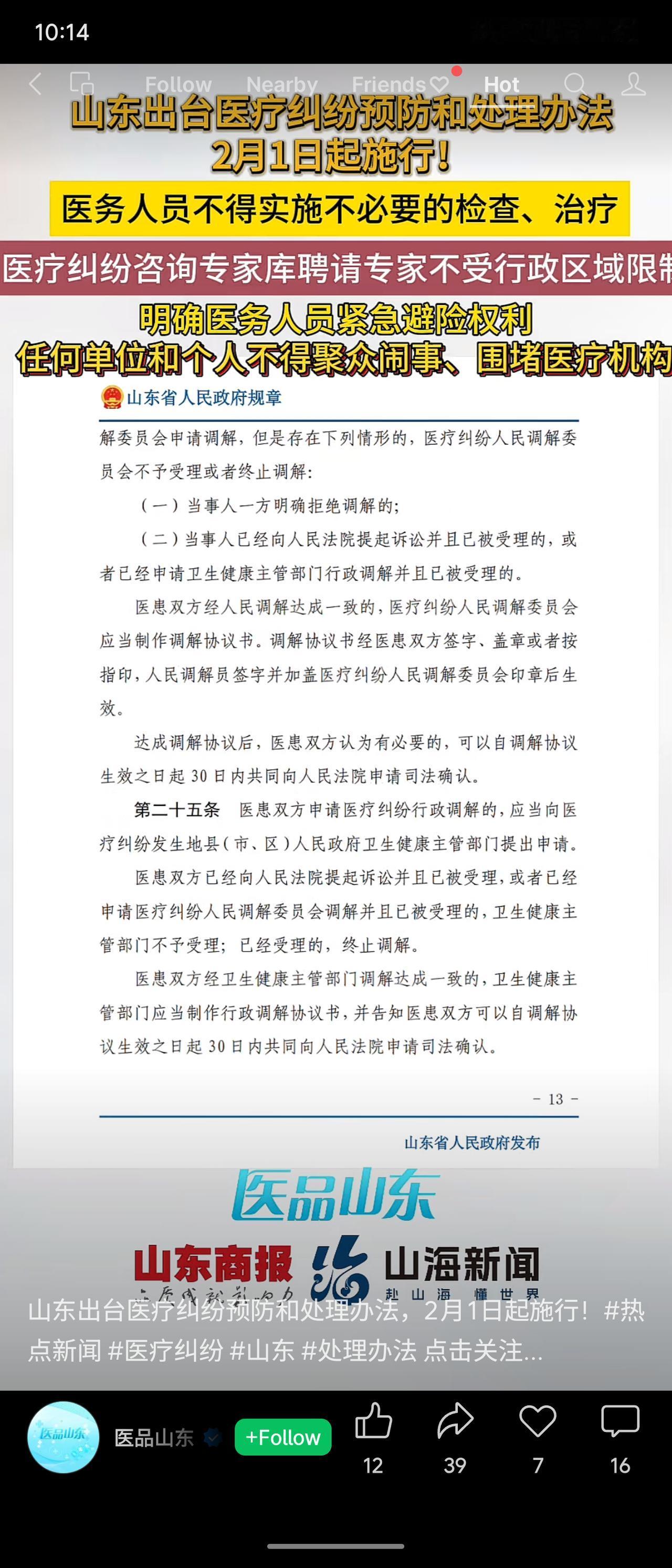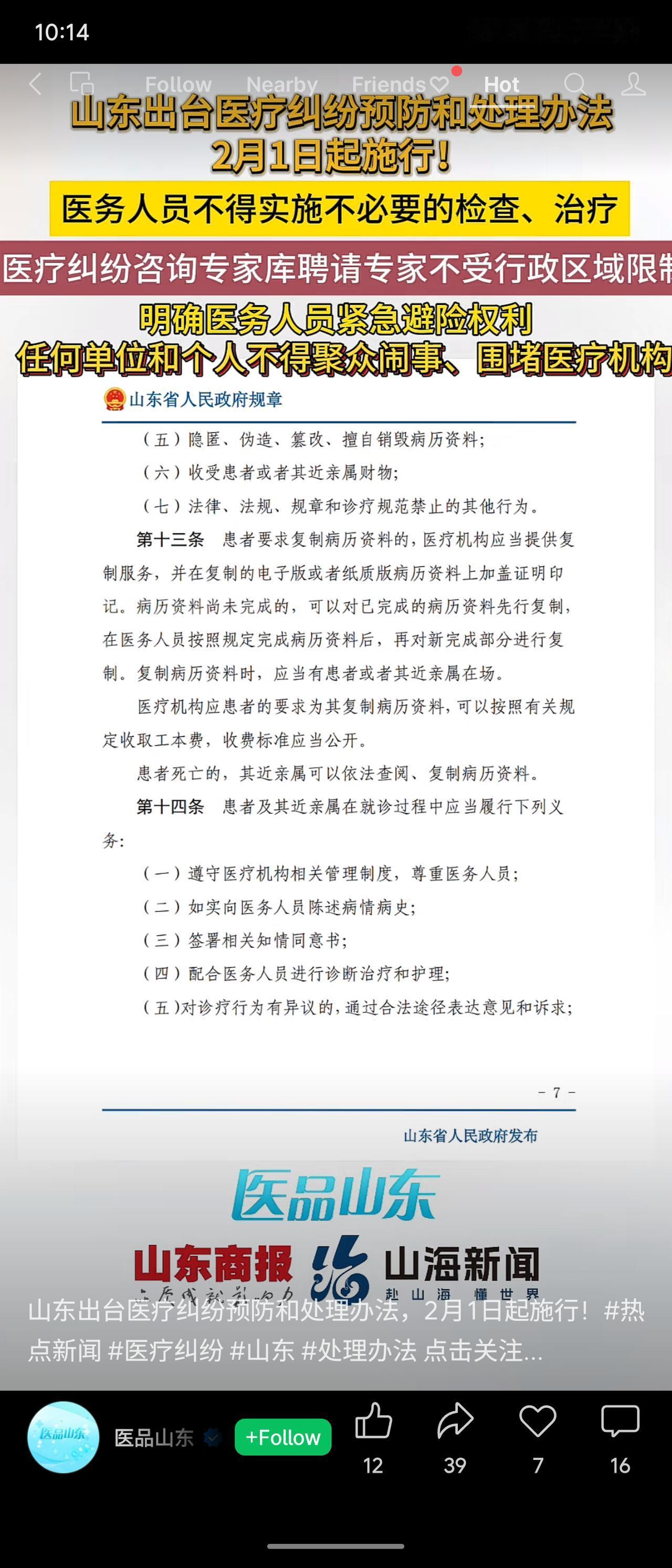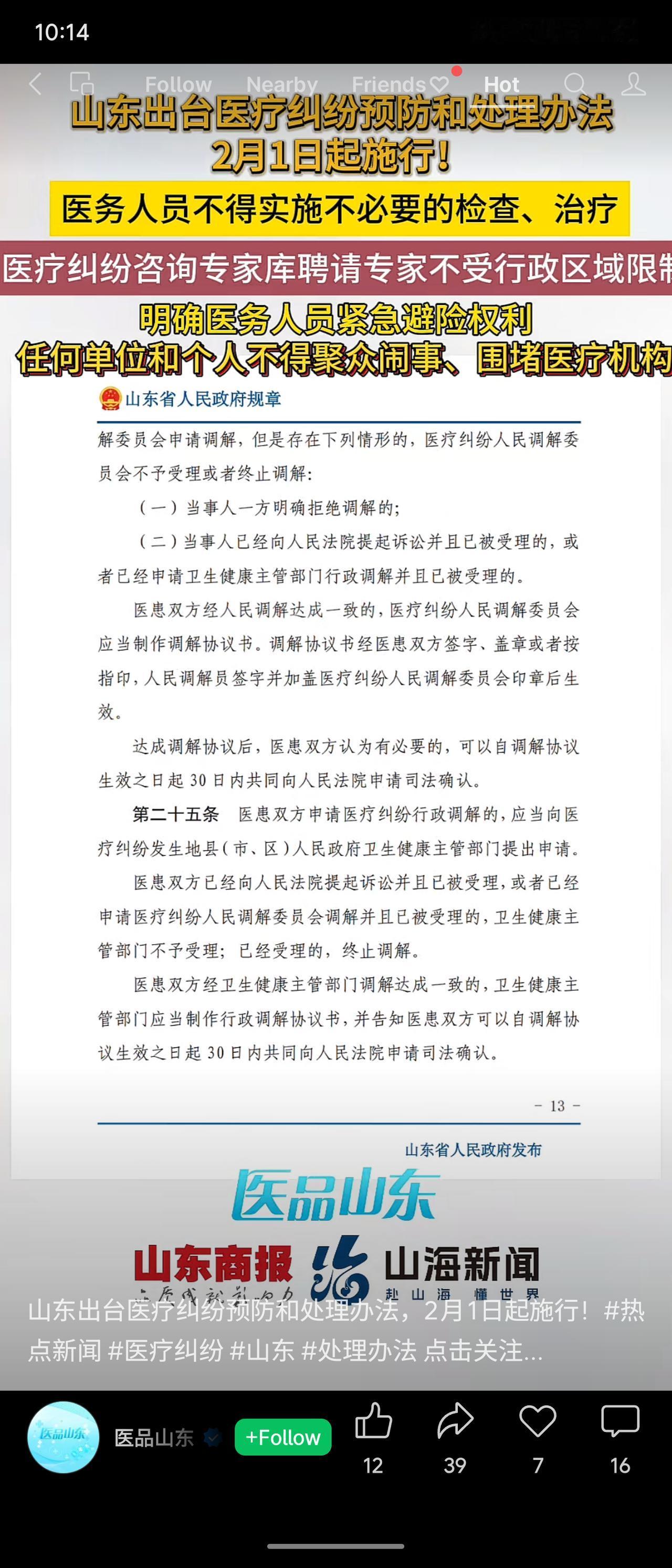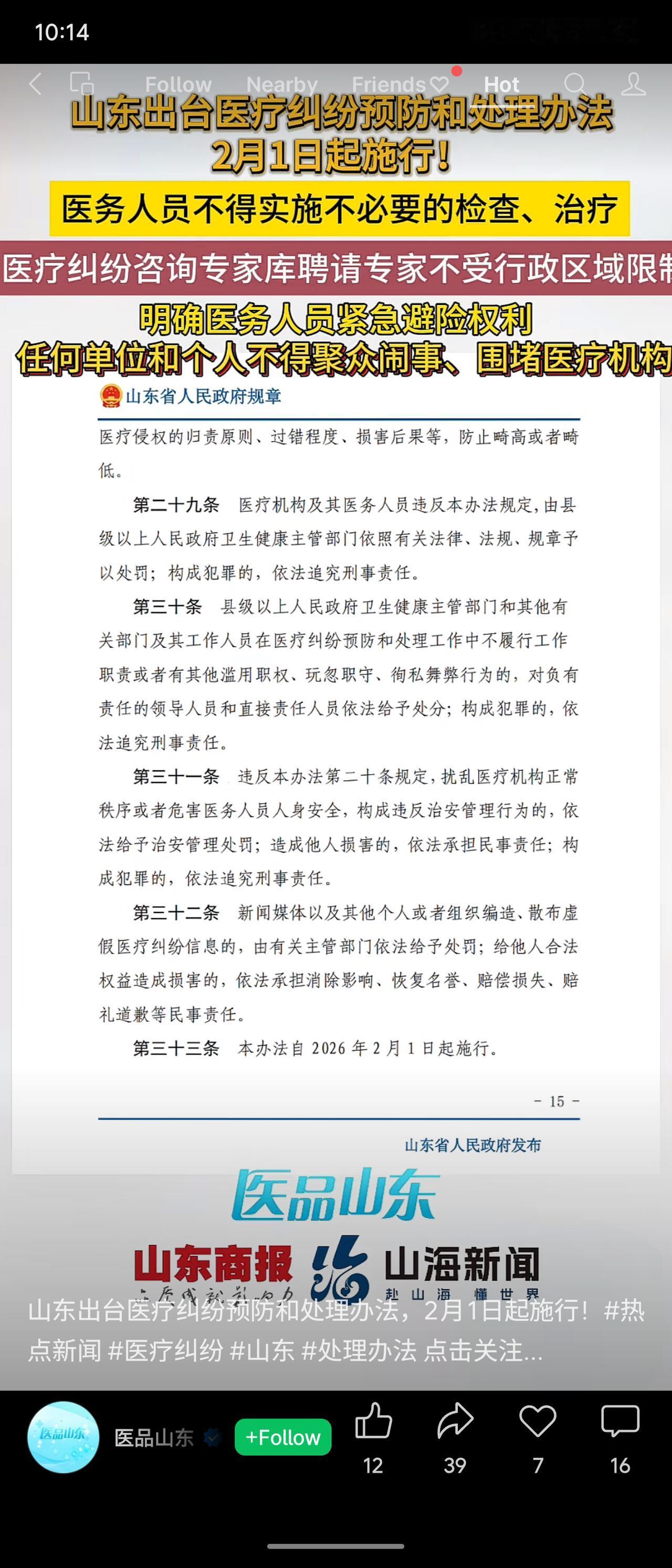 山东省出台《医疗纠纷预防和处理办法》,自2026年2月1日起施行。新规核心内容包括:禁止医务人员实施不必要的检查、治疗;组建跨区域医疗纠纷咨询专家库;明确医务人员紧急避险权,并严禁任何单位和个人聚众闹事、围堵医疗机构。同时,详细规定了医患双方的权利义务、纠纷处理途径(协商、调解、诉讼)、病历管理、风险分担机制以及各方法律责任。 评价新规特点: 1. 双向规范,侧重秩序维护:在规范医疗行为、提升服务质量的同时,重点强调维护医疗秩序、保障医务人员安全与合法权益,打击“医闹”行为。 2. 程序清晰,构建多元化解机制:明确了从院内沟通、人民调解、行政调解到司法诉讼的完整纠纷处理链条,鼓励通过调解途径解决,并引入专家咨询提供专业参考。 3. 权责明确,强化预防与管理:对医疗机构、医务人员、患者及家属分别设定了具体义务,并推动医疗责任保险,致力于从源头预防和系统化处理纠纷。 该办法旨在构建更理性、有序、法治化的医疗环境。