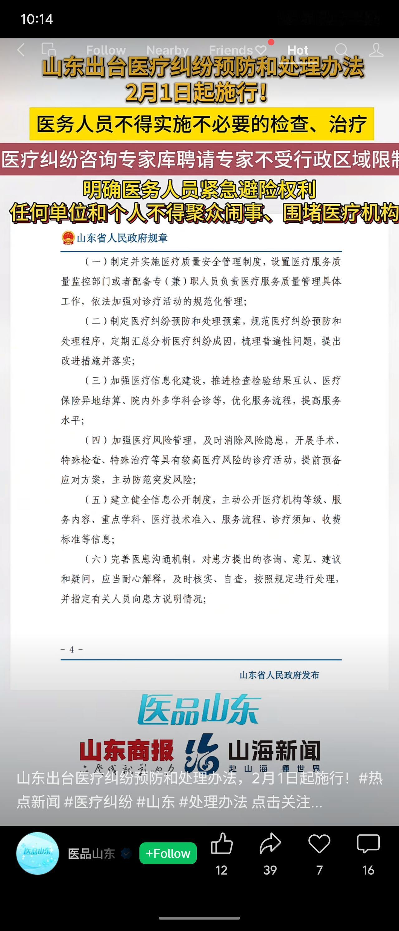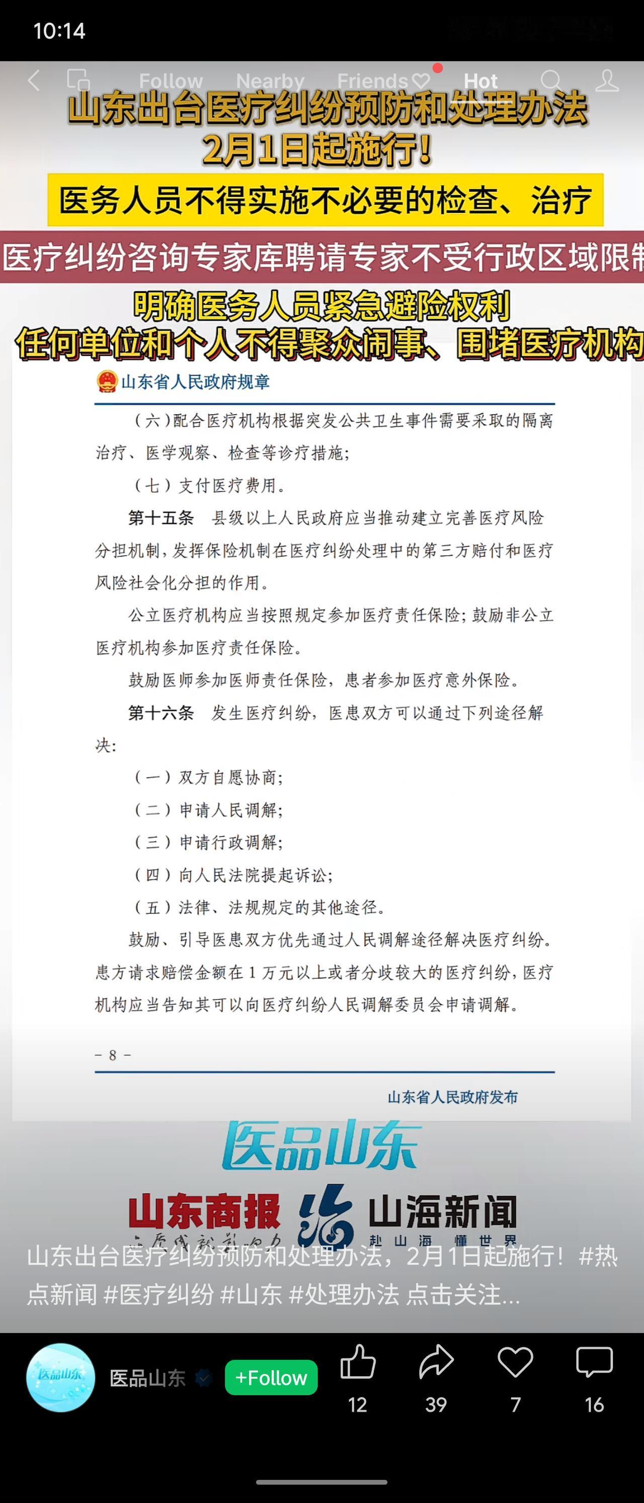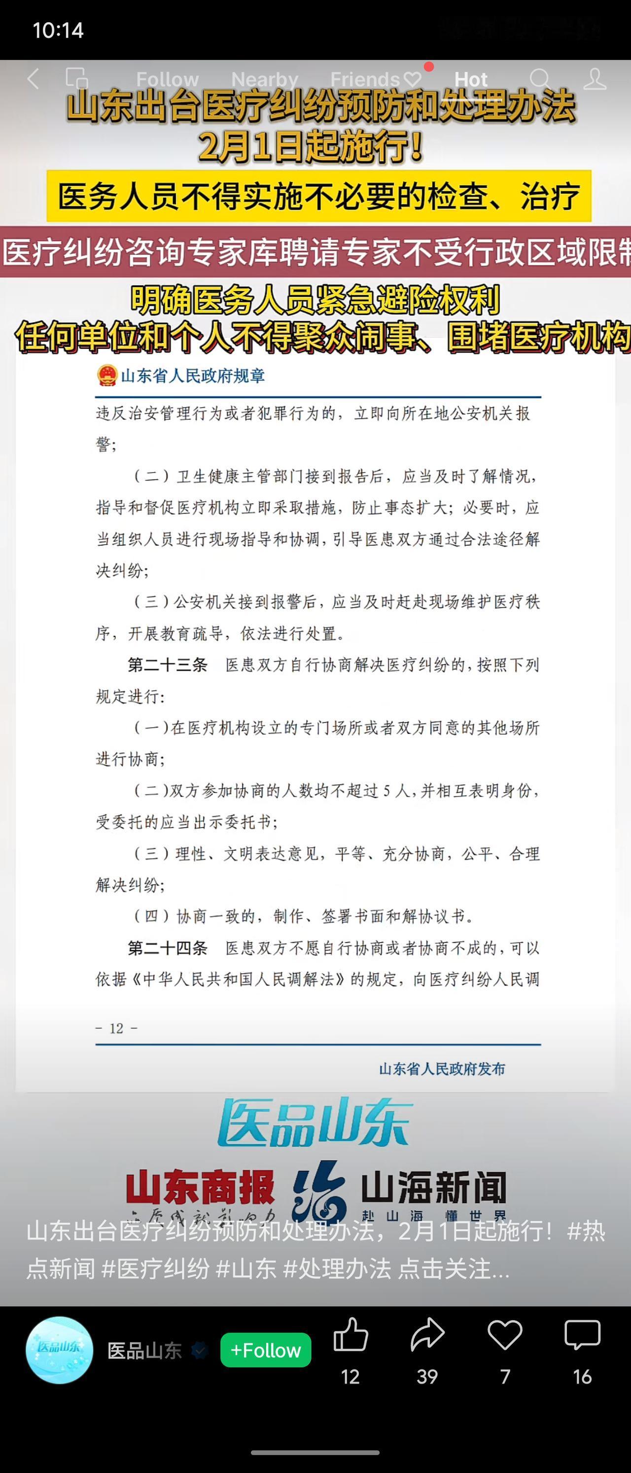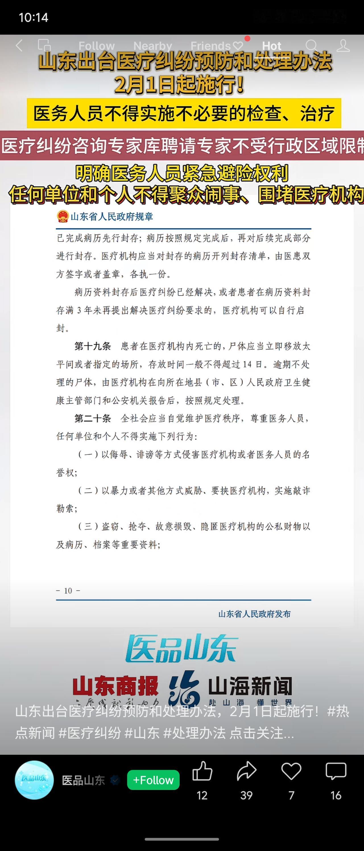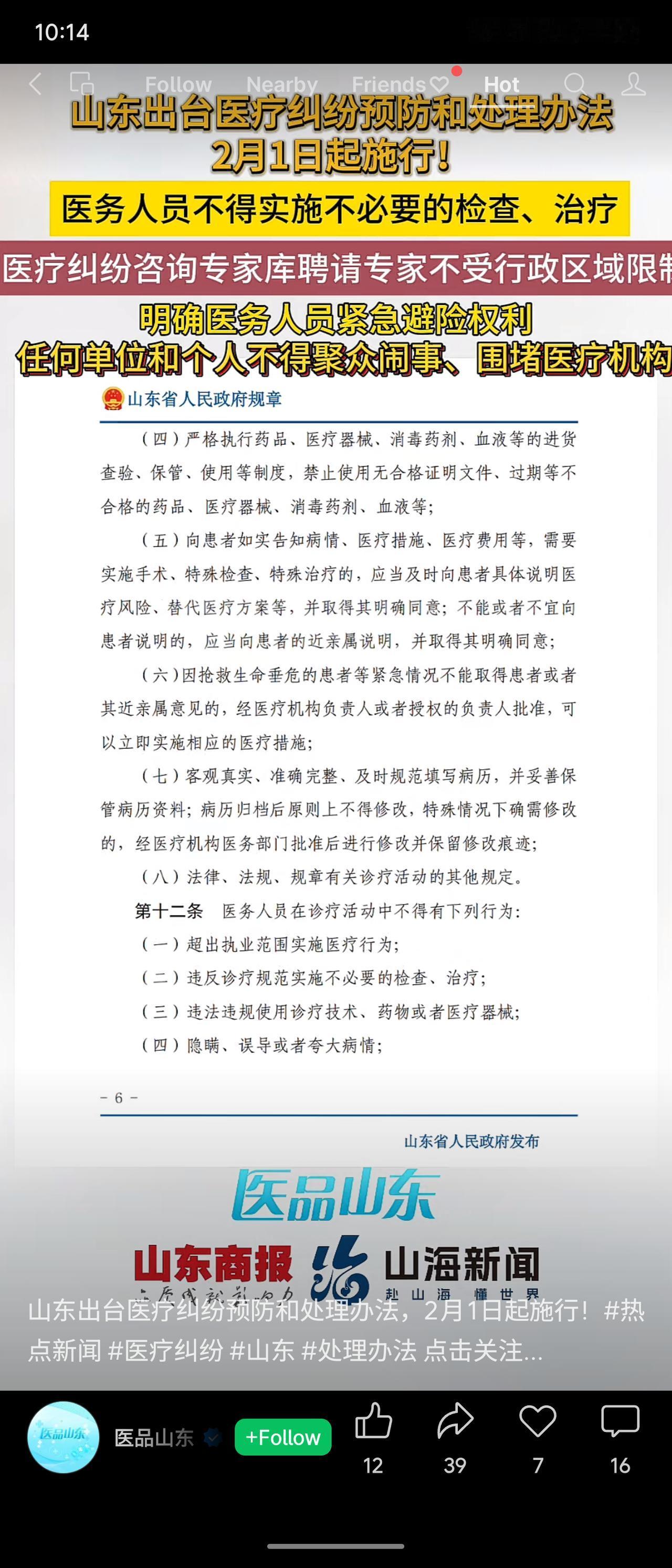 山东省出台《医疗纠纷预防和处理办法》,自2026年2月1日起施行。新规核心内容包括:禁止医务人员实施不必要的检查、治疗;组建跨区域医疗纠纷咨询专家库;明确医务人员紧急避险权,并严禁任何单位和个人聚众闹事、围堵医疗机构。同时,详细规定了医患双方的权利义务、纠纷处理途径(协商、调解、诉讼)、病历管理、风险分担机制以及各方法律责任。 评价新规特点: 1. 双向规范,侧重秩序维护:在规范医疗行为、提升服务质量的同时,重点强调维护医疗秩序、保障医务人员安全与合法权益,打击“医闹”行为。 2. 程序清晰,构建多元化解机制:明确了从院内沟通、人民调解、行政调解到司法诉讼的完整纠纷处理链条,鼓励通过调解途径解决,并引入专家咨询提供专业参考。 3. 权责明确,强化预防与管理:对医疗机构、医务人员、患者及家属分别设定了具体义务,并推动医疗责任保险,致力于从源头预防和系统化处理纠纷。 该办法旨在构建更理性、有序、法治化的医疗环境。