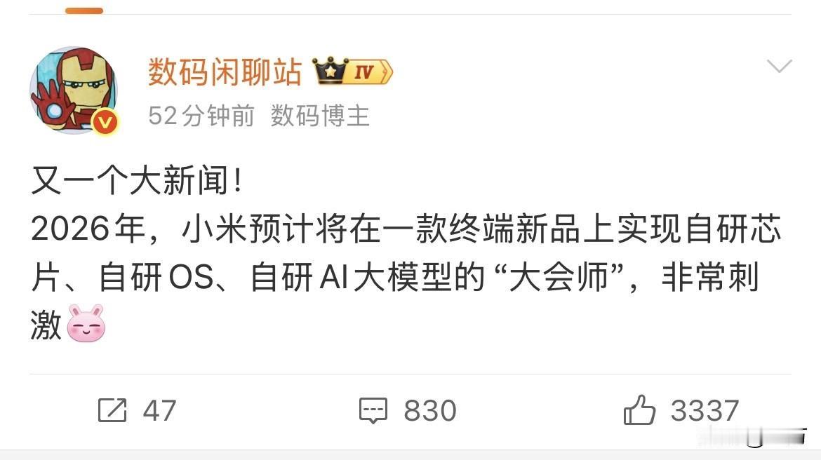 开年大动作: 小米预计将在一款终端新品上实现自研芯片、自研OS、自研AI大模型的“大会师”! 就在刚才,有数码媒体,通过渠道了解到,等不到多久的时间,小米就要来一个三大自研的新产品! 这一次就完全实现了,从最核心的芯片,到整个渠道的硬件,到使用的系统,以及AI大模型,全部都实现了小米的自主知识产权自主研发。 也就是说,目前在国产电子产品领域,会迎来一个真正的百分之百的纯纯的自我知识产权,纯自我研发的产品。 所以小米在这个产品的定位上应该具有一定的代表性和广泛性,所以很多人在问数码博主,会不会是机器人,他肯定说不是。 而且比较直观的说出来,就是普通的电子消费产品,那也就意味着这个产品要么是电脑,要么是平板,要么是手机就是这三个产品的三选一。 如果小米想在这个具有象征意义的产品上,还把这个产品做得比较好,把销量也冲起来,那么大概率他会出一款相对比较有性价比的,大家都会用的产品,但最终到底是什么,目前谁也不敢确定。 不过从这个数码博主多方面透露的信息来看,超过60%以上的几率应该是一个新的手机,因为如果他把这种东西放在一个平板上或者一个电脑上的话,他不是小米最具竞争力的产品。 而且按照时间线的推算,估计这个产品也会放到与小米新的SU7差不多的时间段前后推出,这样刚好是他们发售新手机的时间段,所以是手机的概率是非常大的,但现在也不能够百分之百的确定。 毕竟小米现在发售新手机,它就一定要与之前的更新迭代产品有一点不一样,毕竟现在他都已经弄到小米17U系列了,如果到时候这个具有代表性的新东西出来之后,方方面面都赶不上小米17u。 或者就弄一个相对经济型的东西出来,让大伙都能用得起,先享受一下纯纯国产自研的感觉,这个产品策略要怎么定位?在一定程度上,对小米的产品线来说,还是比较重要的,到时候我们拭目以待吧。