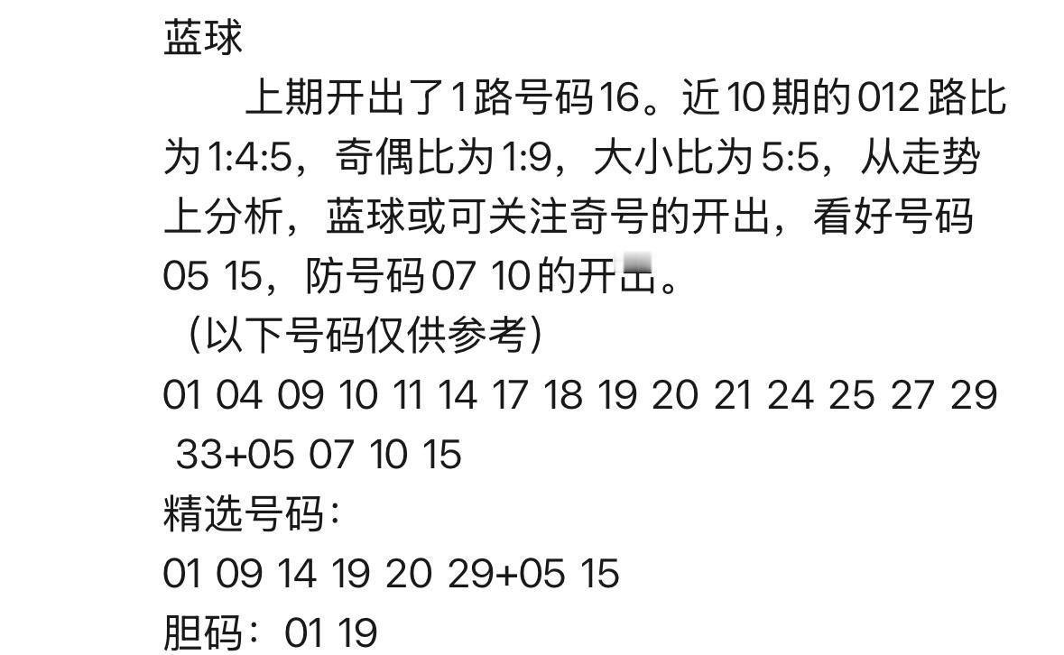 双色球第26004期开奖在即,丹丹再次带着心中那份“幸运号码”如约而至。本期焦点汇聚如下: 红球方面,重号关注09,连号关注19、20,斜连号延续上期走势,看好20、29。红球胆码推荐:01、19。 蓝球四码参考:05、07、10、15,其中重点两码:05、15。 是继续彷徨,还是再续辉煌?一切答案,尽在今晚揭晓。