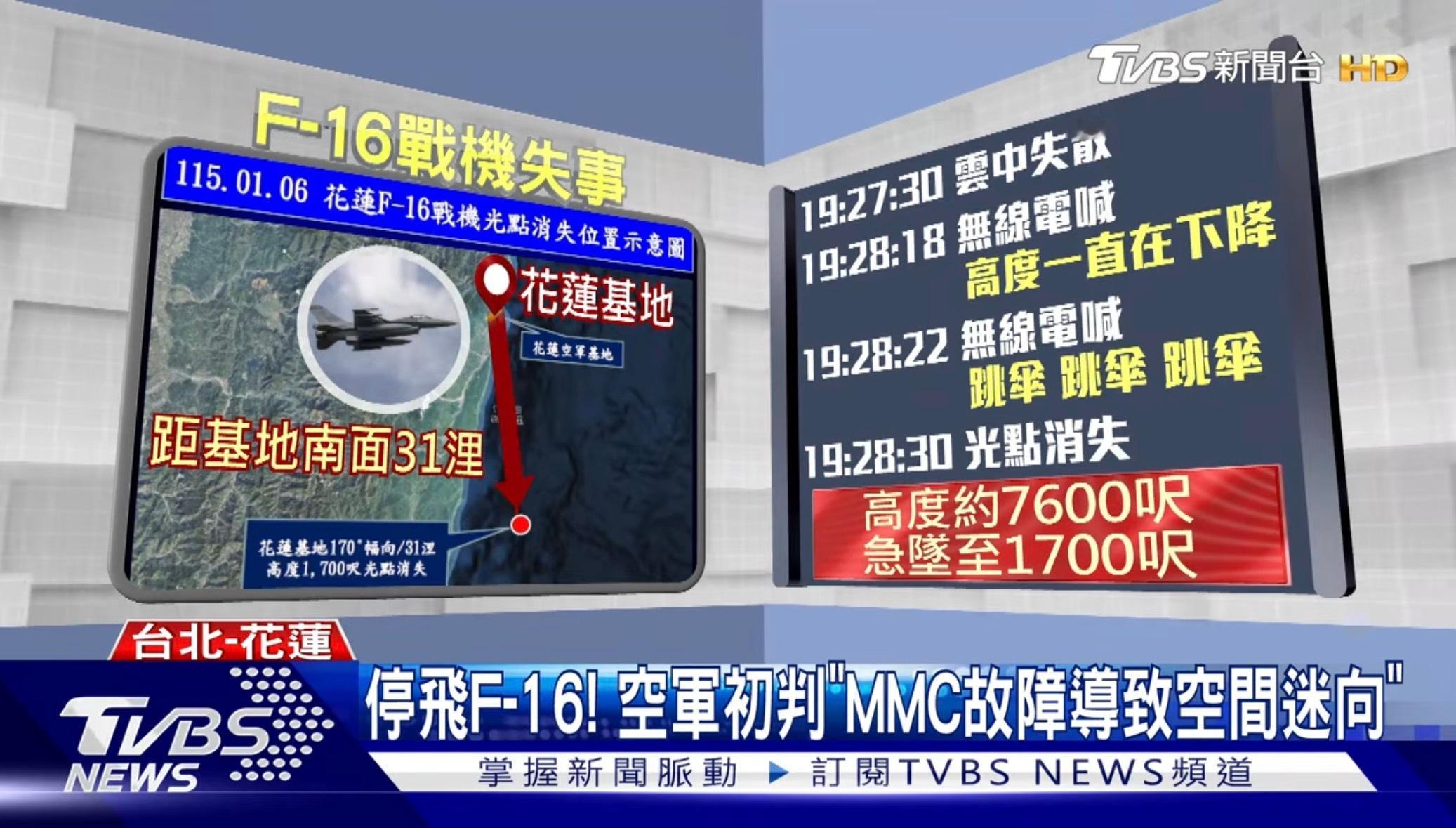 台战机失事飞行员跳伞搜救中 疑问解读1. 仍未搜救到飞行员的原因除了因为海况不佳,更主要的原因是“未截獲求生信標”(图1)。两种可能性:1. 飞行员未成功弹射,2. 弹射落水后“求生信標”失灵。个人认为是飞行员未成功弹射或弹射成功但落水后失能,无法实施人伞分离、获取并使用求生包(图2,内含无线电信标/手台和海水染色剂)等求生救生操作。2. 事故原因从目前披露的情况来看,对岸「空軍」初判事故原因是「MMC故障導致空間迷向」(图3)。个人认为发生事故的过程是在夜航返场穿云下高过程中,MMC(即“Modular Mission Computer”,模块化飞行任务计算机)出现故障导致飞机无法正确处理和显示姿态信息;随后飞行员个人出现空间迷向,慌乱中无法正确处置特情,无法确认并保持飞机的姿态和高度;在高度越来越低的情况下,处置时间窗口越来越短,只能高喊三声“跳伞”(目前也未能实证确实成功弹射)。台军F16坠海飞行员连喊3次跳伞台军F16坠海飞行员最后通话曝光总之事故原因为:机械故障(MMC故障)叠加复杂气象(夜航穿云下高)叠加飞行员对于特情的处置不当。对岸「空軍」初判原因「MMC故障導致空間迷向」实际上是在避重就轻,把责任推到外部因素上,即“MMC是美方的”“空间迷向是正常的”,避而不谈「飛官」本身的「質素」(飞行员未能克服空间迷向错觉,未能及时正确执行特情处置)。这时候可能有朋友要说了:“前面不是说了因MMC故障导致无法正确处理和显示飞机姿态信息吗,姿态信息显示都不可靠那飞行员还如何处置?”。实际上F16战机座舱内都配有独立于其他系统的水平仪/姿态仪(图4),飞行员在处置过程中能相信气压高度计(高度表)并持续报高(度),为什么就不能也相信这个独立于MMC系统的姿态仪呢?从公开的ppt来看,对岸「空軍」「後續處置」(图9)就包括:「1. 機務加強檢查,2. 飛行員實施學科及模擬機訓練,置重點於空間迷向處置、不正常動作改正及夜間儀器行操作要領。」今日战隼军用飞机信息汇 昨天微博:网页链接Image credit:TVBS、东森