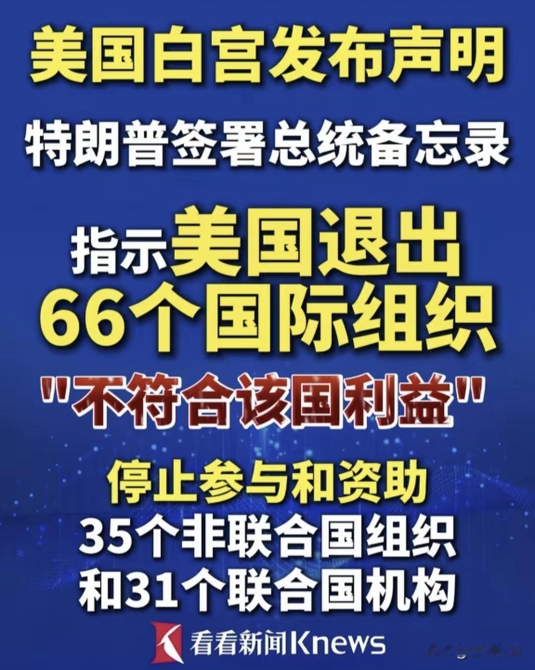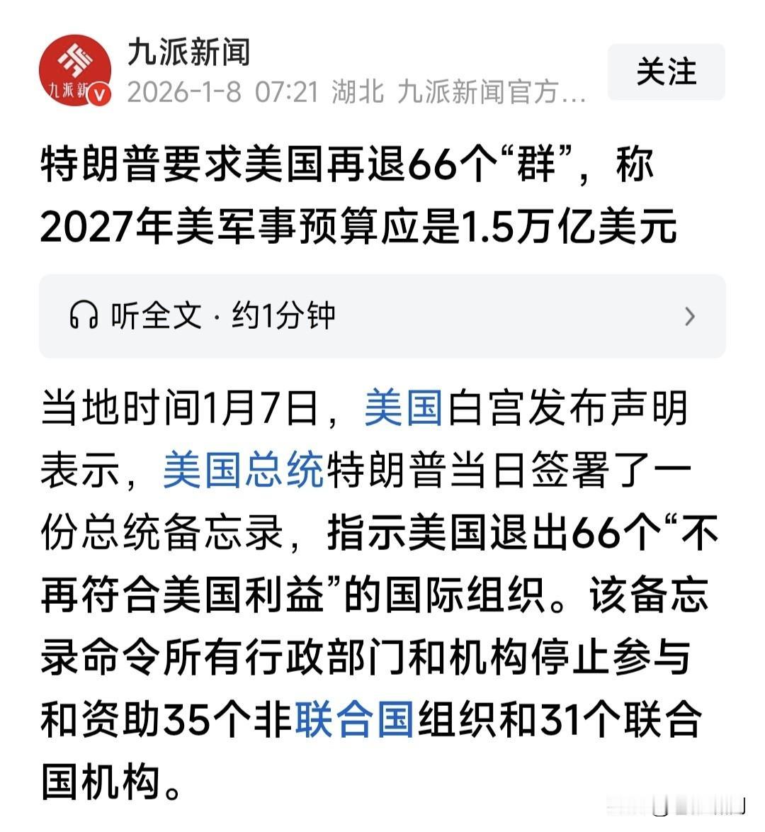 特朗普不做“赔本生意”!指示美国退出66个“国际群”,包括35个非联组织,31个联合国机构。因为参与并资助这些组织,不符合美国利益。 老特是个商人总统,考虑问题只看美国利益,胸无世界大局。自第一任期,就退出不少国际组织。拜登上台后,又恢复加入,挽回一点影响。 这次二次入主白宫,老特又故伎重演,要大肆退群了!而且一次就是66个,力度前所未有。理由是“不符合美国利益”,是不想美国花钱吗? 不仅如此,老特为了美国利益,还要把2027年军费,增加到1.5万亿!他上台后频增军费,2026比2025增加13%,达到1万亿。2027又增加30%。 美国要这么多军费干什么?堂而皇之理由:为了美国利益!实则是打压潜在“对手与爪牙”,比如老特认为的鹅熊与伊古委哥等,这些都需要打压的。 回顾历史,美国确为不少国际组织,包括非联组织与属联机构,资助不少钱,用于国际主义和人道救援!但川普为美国利益要“退群”,是对还是错? 实话实说,不仅是这66个国际组织,即便是联合国,老特似乎也不稀罕,曾要团队研究:存在于联大必要性,只是鉴于目前世界乱局,未退而已。 其实现在世界上,没把联合国看在眼里的国家,不仅是美国,还有以色列与俄罗斯!以色列敢在联大会议上,粉碎“联合国宪章”。俄罗斯若尊重联合国,还会对乌克兰发动军事行动吗? 美俄以三国,是当下世界三“刺头”!不说以色列,它是老美“小跟班”。主要是美俄争夺全球霸权,世界势力范围。川普要1.5万亿军费干啥?懂者自懂。且看老特任期内,谁能治住谁呢? …………