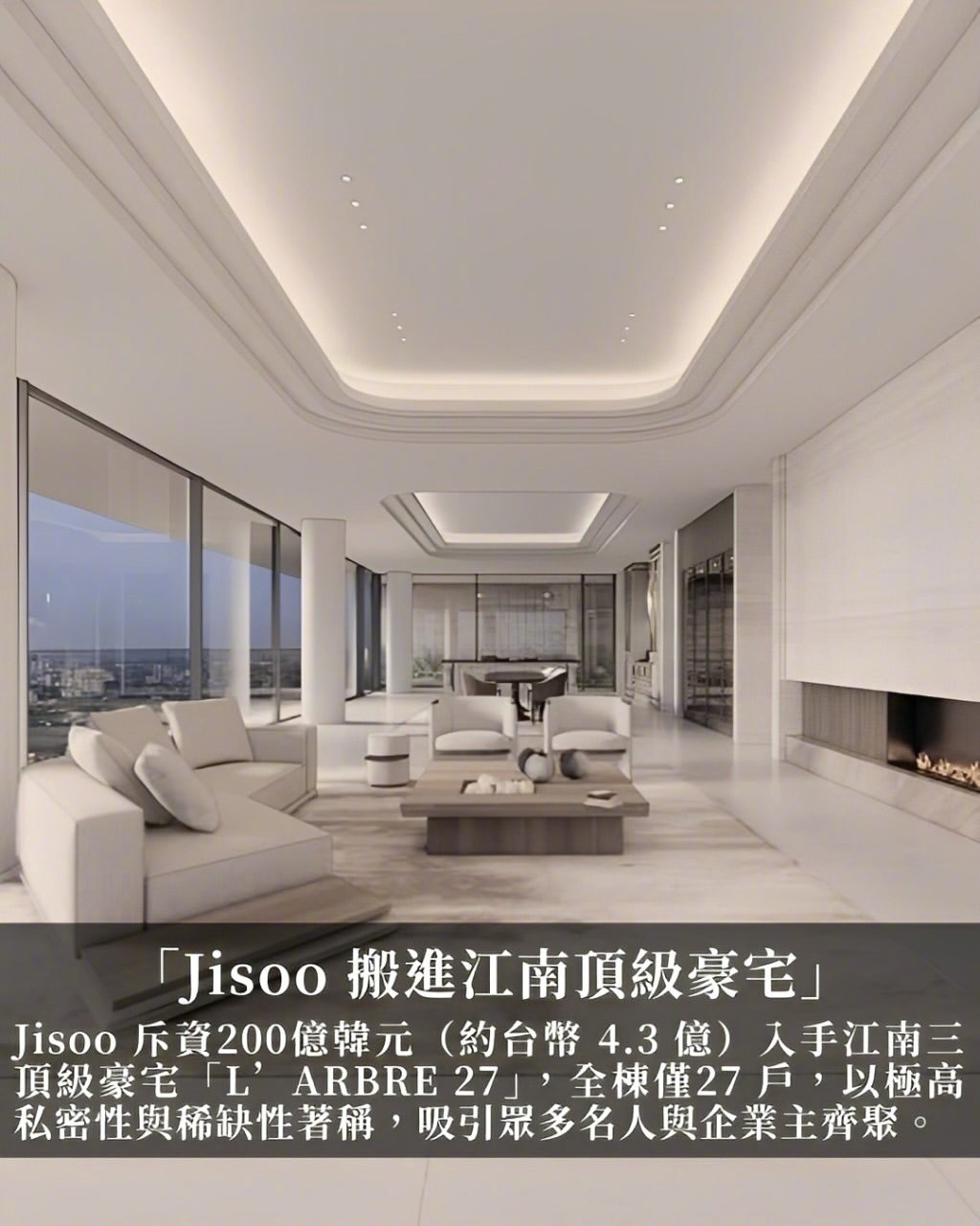 金智秀 Jisoo 8800 万人民币购入江南新居!这个仅 27 户的“树屋豪宅”现已成为韩国话题焦点。江南区是象征韩国“老钱”与高资产家庭生活方式的地段!Jisoo 在江南三成洞核心地带购入的这套“L’ARBRE 27”豪宅,价格数十亿韩元。这座仅 27 户的高端住宅社区以明亮开阔的采光设计与极高私密性脱颖而出,完工前就全数完售,邻居还有 HYBE 创办人房时赫 。27 户在完工前已全数完售。L’Arbre 27 采用尖端的“神经建筑学”设计理念,从色彩、光线到空间布局都经过科学验证,能让住户达到最放松舒适的居住体验。建筑由地下 5 层延伸至地上 7 层,每户都拥有超大私人露台与花园,在首尔市中心也能享受被绿意包围的奢华感受。