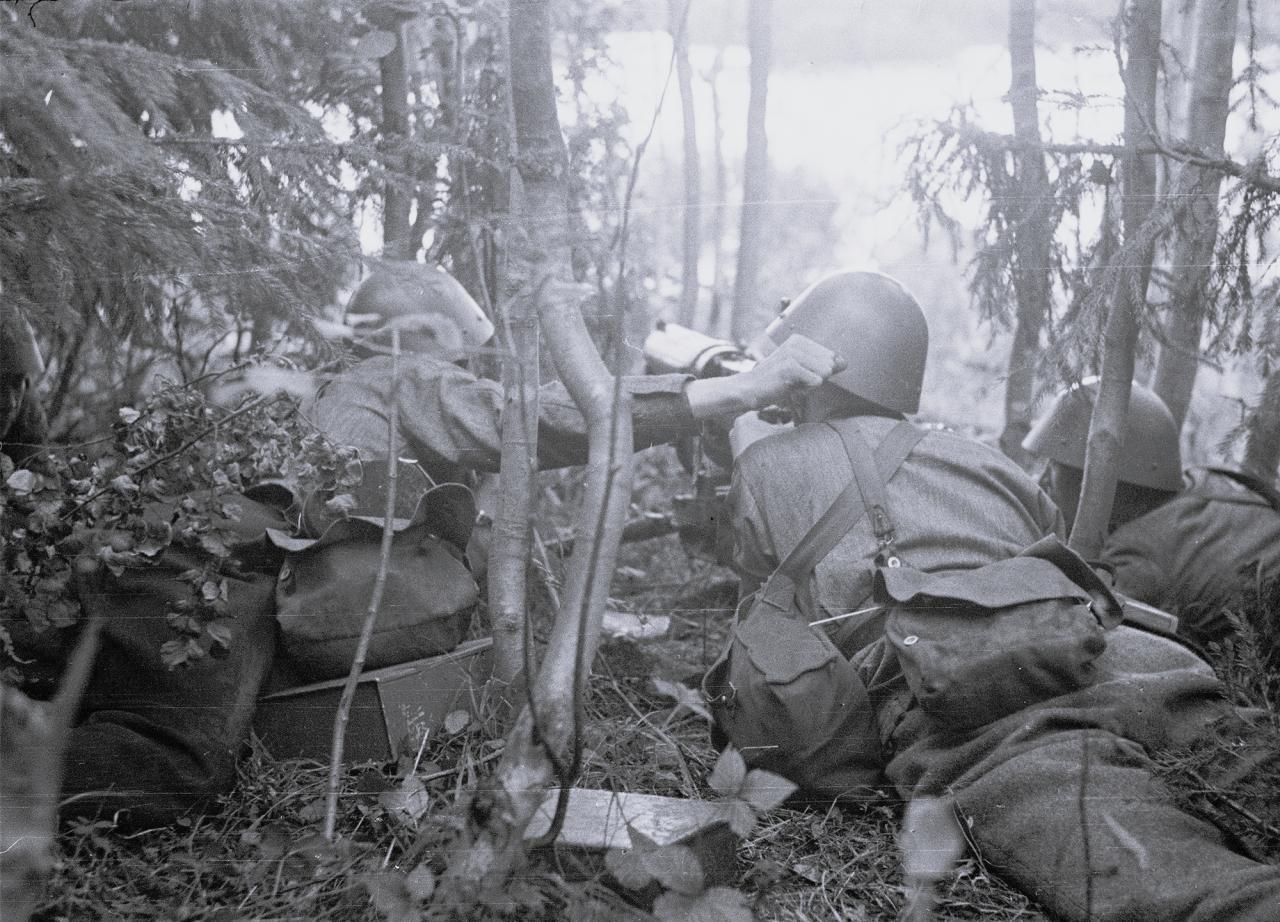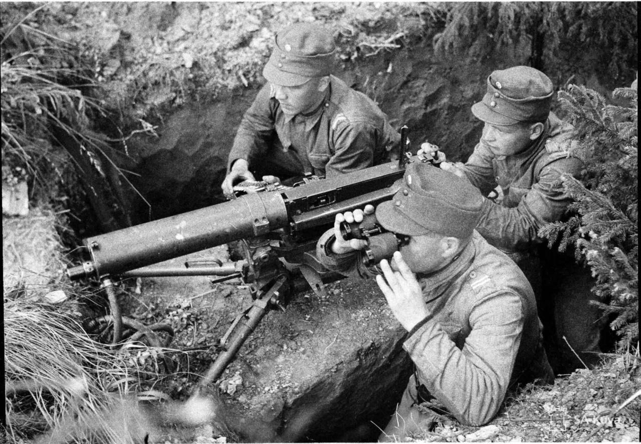 1941 年,芬兰,索尔塔瓦拉地区。芬兰军队一个马克沁 M/32-33 型重机枪的机枪组在一处森林阵地开火射击。 当时,芬兰为了夺回 1939—1940 年冬季战争中被苏联占领的卡累利阿地峡等领土,在德国支持下对苏宣战。索尔塔瓦拉作为拉多加湖北岸的交通枢纽,是双方争夺的核心据点。苏军在此部署了防御工事,而芬兰军队则依托森林地形展开进攻。 马克沁 M/32-33 重机枪(参见图2)是芬兰对俄制马克沁 M1910 重机枪的本土化升级型号,1932—1933 年由芬兰国家兵工厂完成改造,核心改进包括:更换轻量化两脚架,替代原版笨重的轮式枪架,更适合森林机动作战;加装枪口制退器,降低持续射击时的后坐力,提升射击精度。 马克沁 M/32-33 采用水冷式枪管设计,理论射速 600 发 / 分钟,可连续射击 300 发以上无需更换枪管,这一优势在森林阵地的防御战中至关重要 —— 能有效压制苏军的步兵冲锋和轻型坦克突击。 标准的马克沁 M/32-33 机枪组由 3 人组成(参见图3):射手负责瞄准射击,通常是经验丰富的老兵,擅长短点射(5—10 发)打击集群目标,避免枪管过热;副射手负责装填弹药、更换枪管和观察目标,同时携带备用枪管与冷却水;弹药手携带 2—3 个弹药箱(每个含 250 发弹链),并负责阵地的伪装与警戒,防止苏军渗透部队偷袭。
