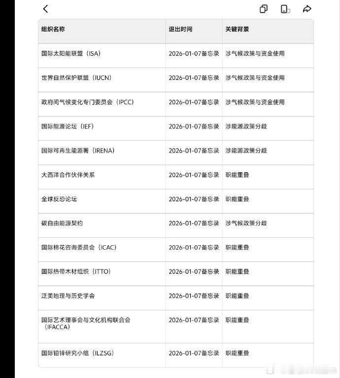 特朗普要求美国再退66个群美国一口气退66个群当地时间2026年1月7日,美国总统特朗普签署总统备忘录,正式要求美国退出66个“不再符合美国利益”的国际组织。该命令要求所有行政机构停止参与和资助35个非联合国组织和31个联合国机构。