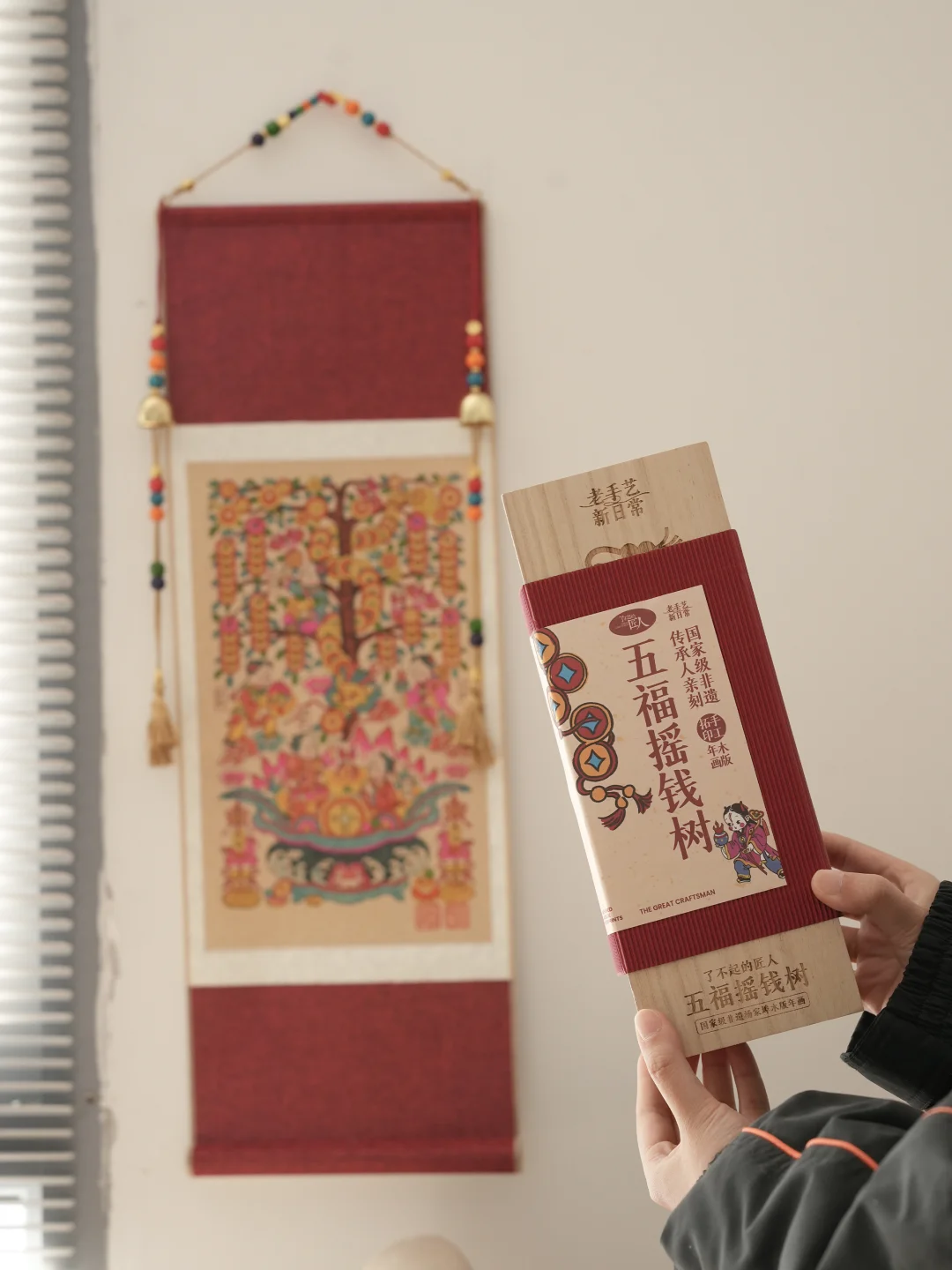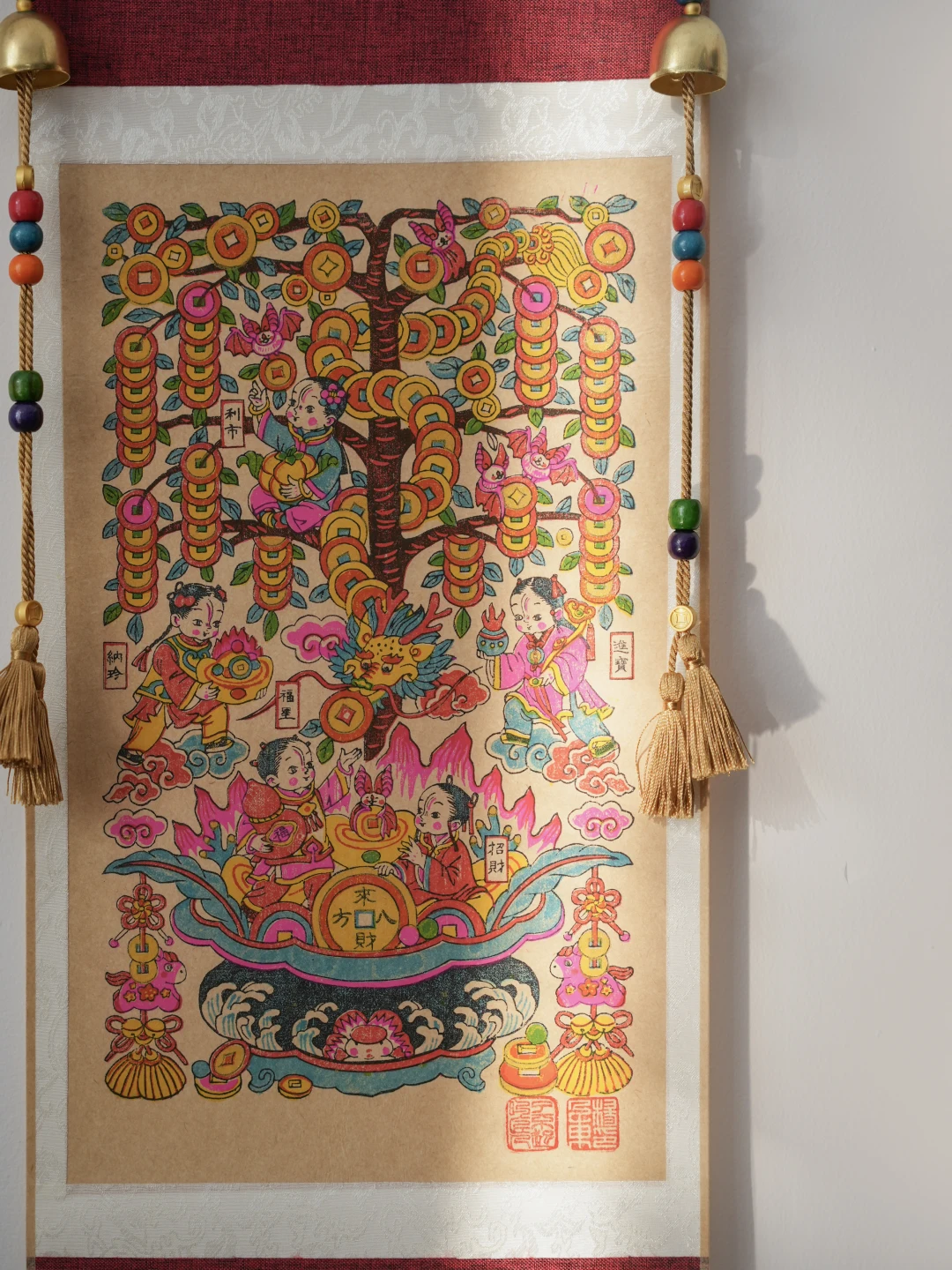 卷轴没有过时 你可以永远相信东方美学!!! 传统的装帧方式+木版年画 做出了这张「五福摇钱树」卷轴挂画📜 希望在马年能给大家带来好运 同时也可以为你的家 增加氛围感🏠 摇钱树、童子、聚宝盆 铜钱小马、翼展蝙蝠..共同组成了画面 兼具了民俗与现代艺术感 每一样都象征着财运与好运 挂在家里非常治愈 会更加期待新年~ 每一张都是五色套印 装裱也全都是手工 还无法用机器生产 这样做出来的卷轴年画才有灵魂 客厅、卧室、书房 它都能完美契合 我们也想到了新年送礼的朋友 配备了桐木礼盒🎁 送人有面也有心意!! 预售陆续到货 都会尽快发到大家手上 今年只做了一部分 越到后面越没货了....