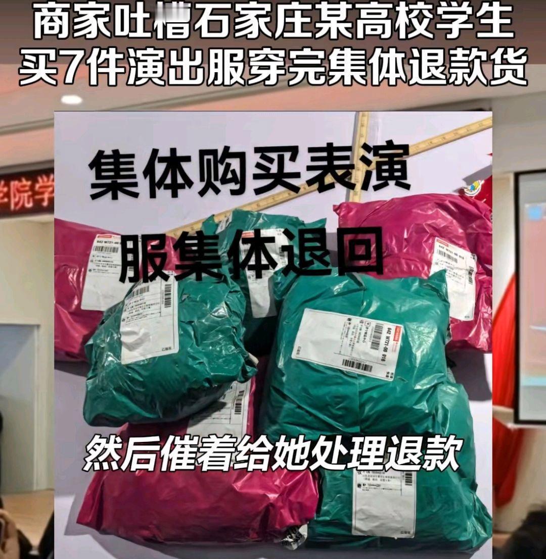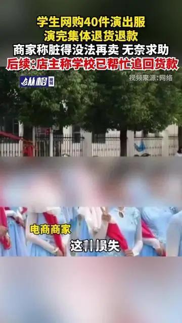 多地学生穿脏演出服退货“薅羊毛”,商家和校方如何应对? 近年来,商家曝出多地学生在演出结束后,将踩脏的演出服退货的现象频发。例如,河北衡水市武邑县某高中和江西某学校的学生在演出后,将脏污的演出服退回,声称服装质量问题。商家称只想解决问题,不愿给学校添麻烦,已有几名学生联系解决此事。此外,山东宁德市寿宁县东区小学部分学生也在参加元旦演出后,将网购的演出服退货,部分服装还被剪掉了标签。这些事件引发了社会各界对于学生行为和商家权益保护的关注。商家呼吁平台优化退货规则,加强审核机制,同时提醒消费者应遵守公平交易的基本准则。 演出服退货事件 网购演出服