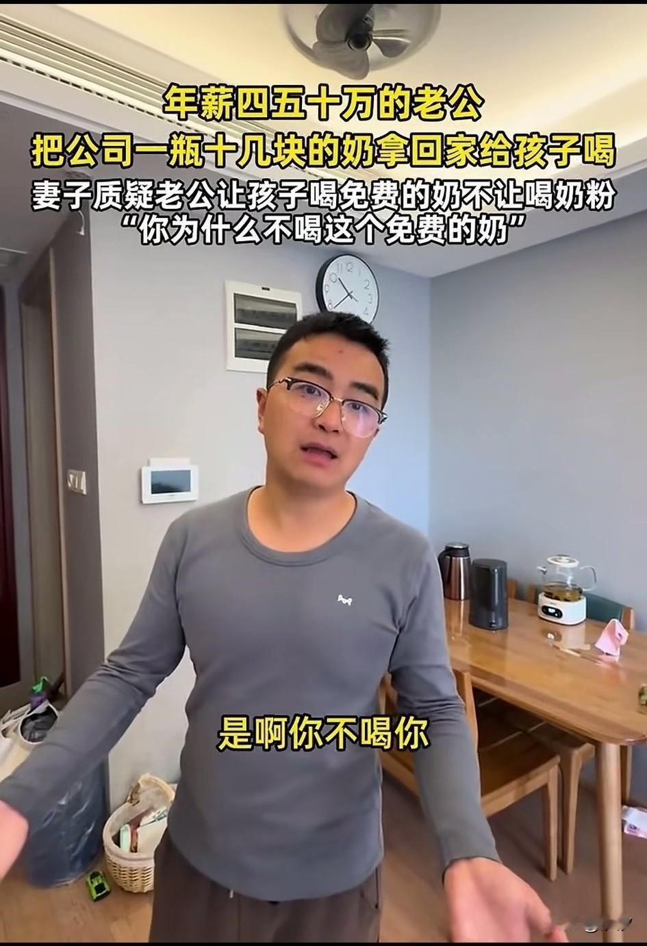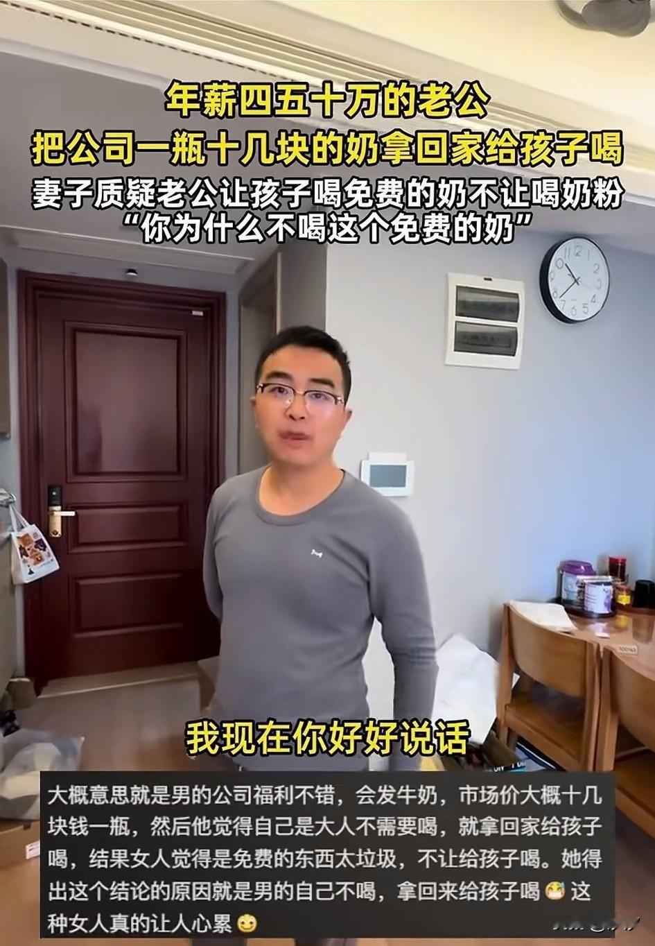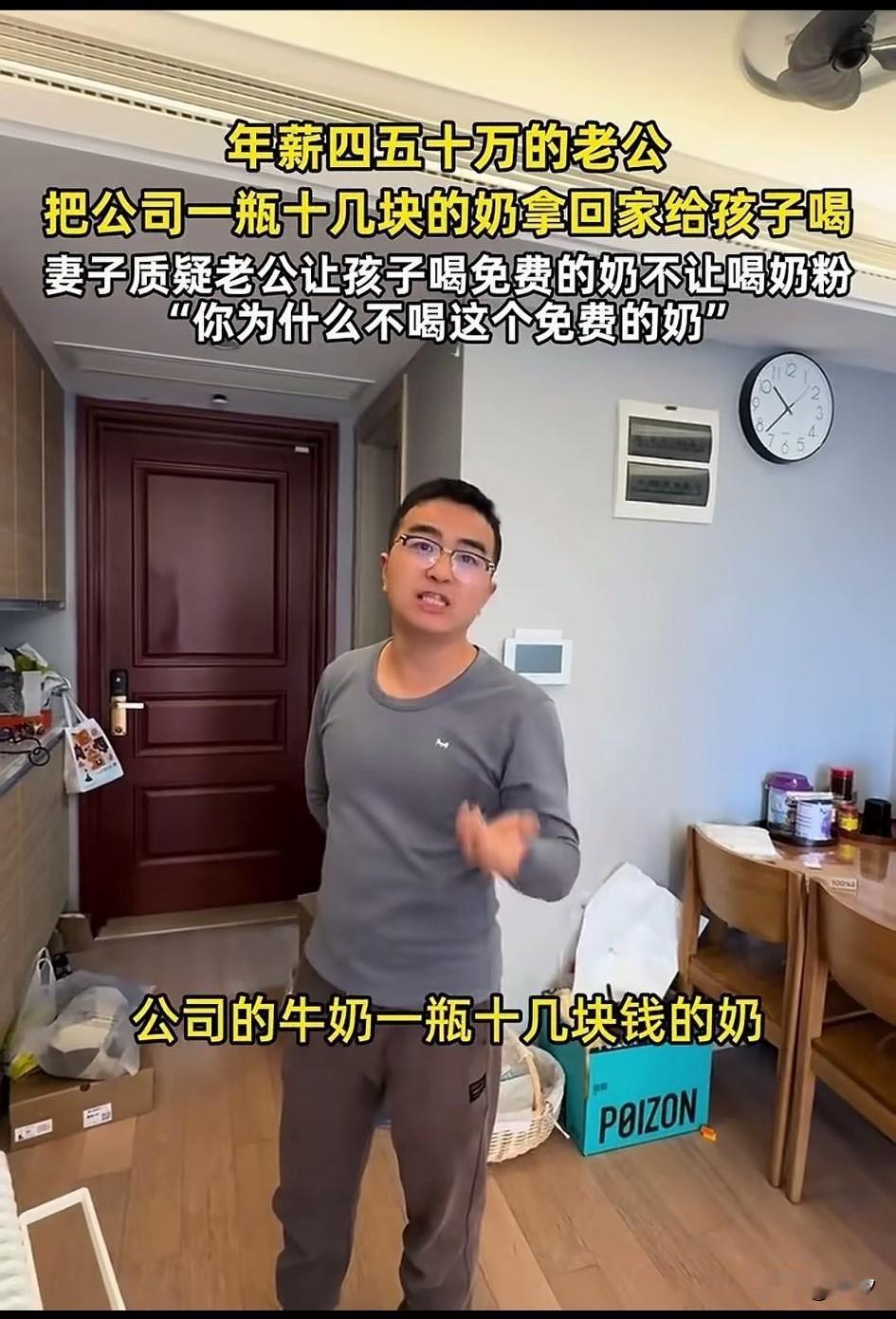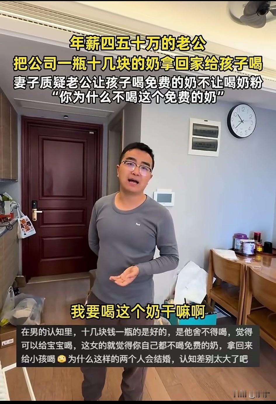 浙江这对夫妻吵起来了, 男人一年工资四五十万, 公司的福利非常好, 给他们发了十几块钱一瓶的奶, 他不舍得喝就带回了家, 觉得这奶也挺贵的, 让自己的孩子喝, 结果他的媳妇儿生气, 觉得他都不喝的免费奶, 让自己的孩子喝, 而不让自己的孩子喝奶粉, 这样的人简直太可恶了, 于是就和老公吵了起来, 她的老公表示这奶非常的贵, 我是不舍得喝才带回来, 他媳妇儿质问他,你为什么, 她说我喜欢喝可乐, 这可把他媳妇儿气的不行, 更加怀疑老公就是让孩子喝免费的牛奶,而不让喝奶粉! 网友表示这两个人的认知有偏差, 真不知道年薪四五十万的男人怎么娶了这个媳妇儿, 还有网友表示老公不喝免费的牛奶给孩子喝,这样的媳妇儿真让人心累! 更有网友表示娶个好媳妇儿比上个985都重要! 夫妻之间因为这点小事儿都吵成这样,看来两个人之间的信任很薄弱,想必以后也会因为其他的事情争得面红耳赤! 大家对于浙江女子质疑自己老公这事怎么看? 浙江 夫妻相处,最怕的是什么 丈夫工资