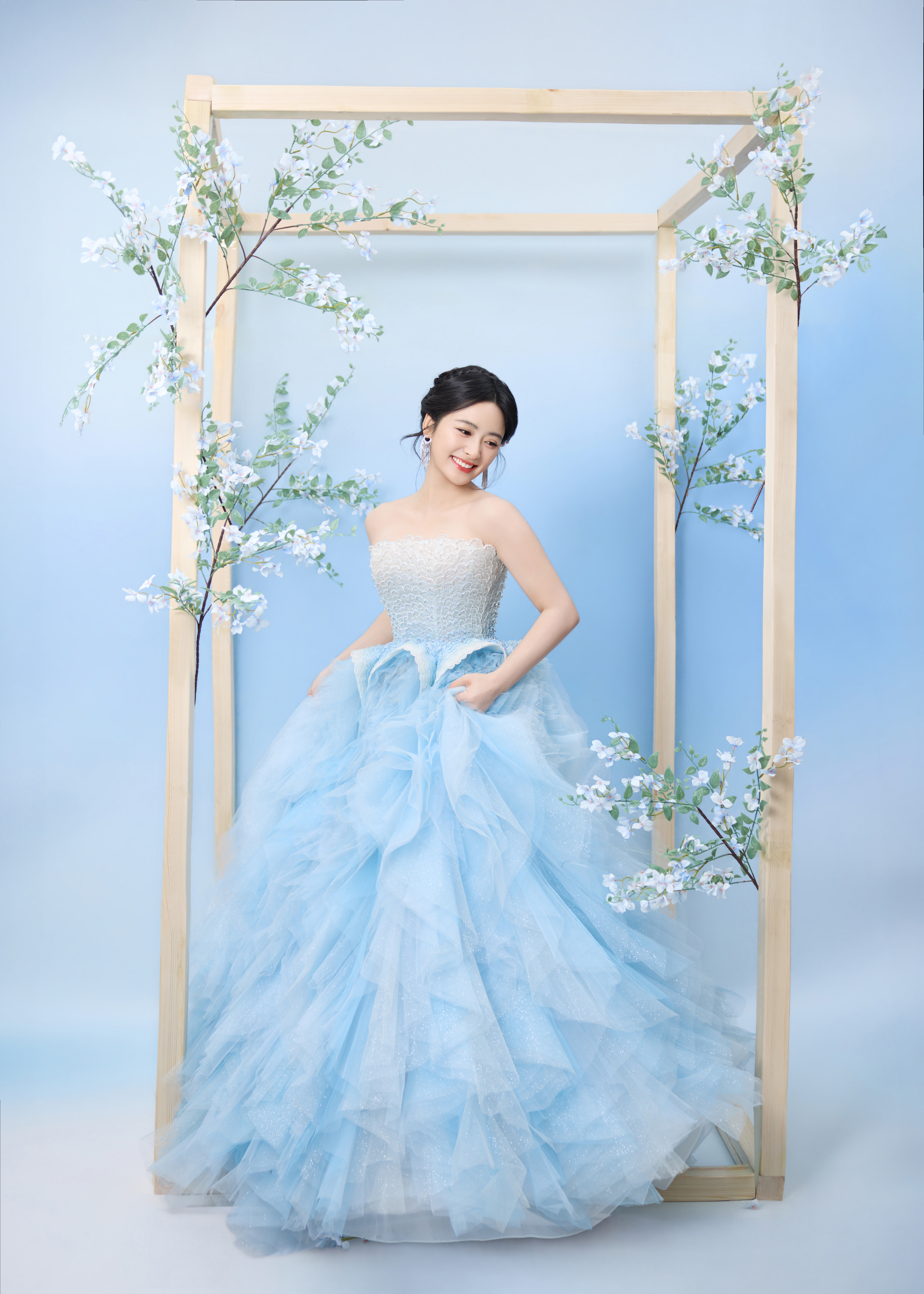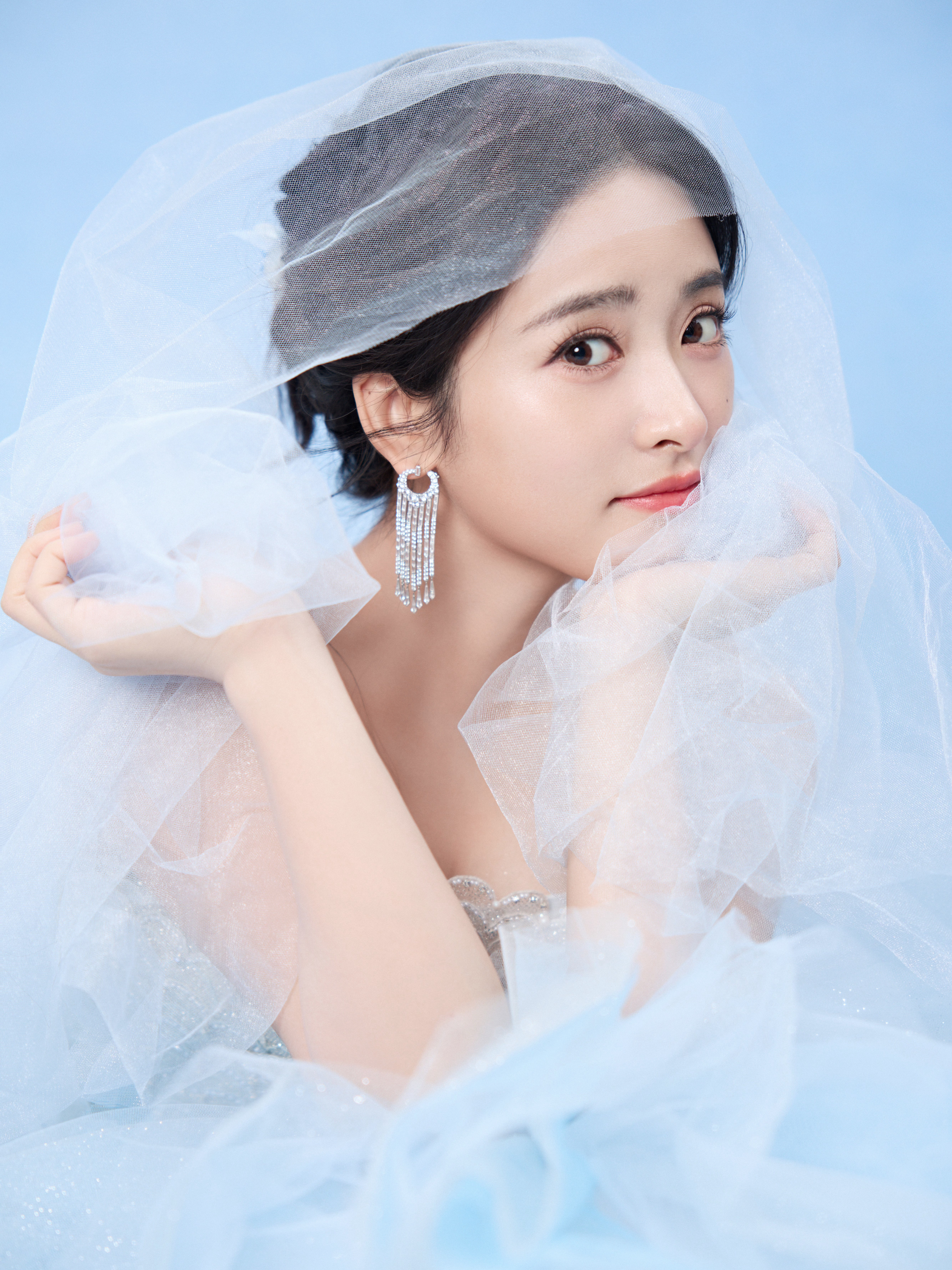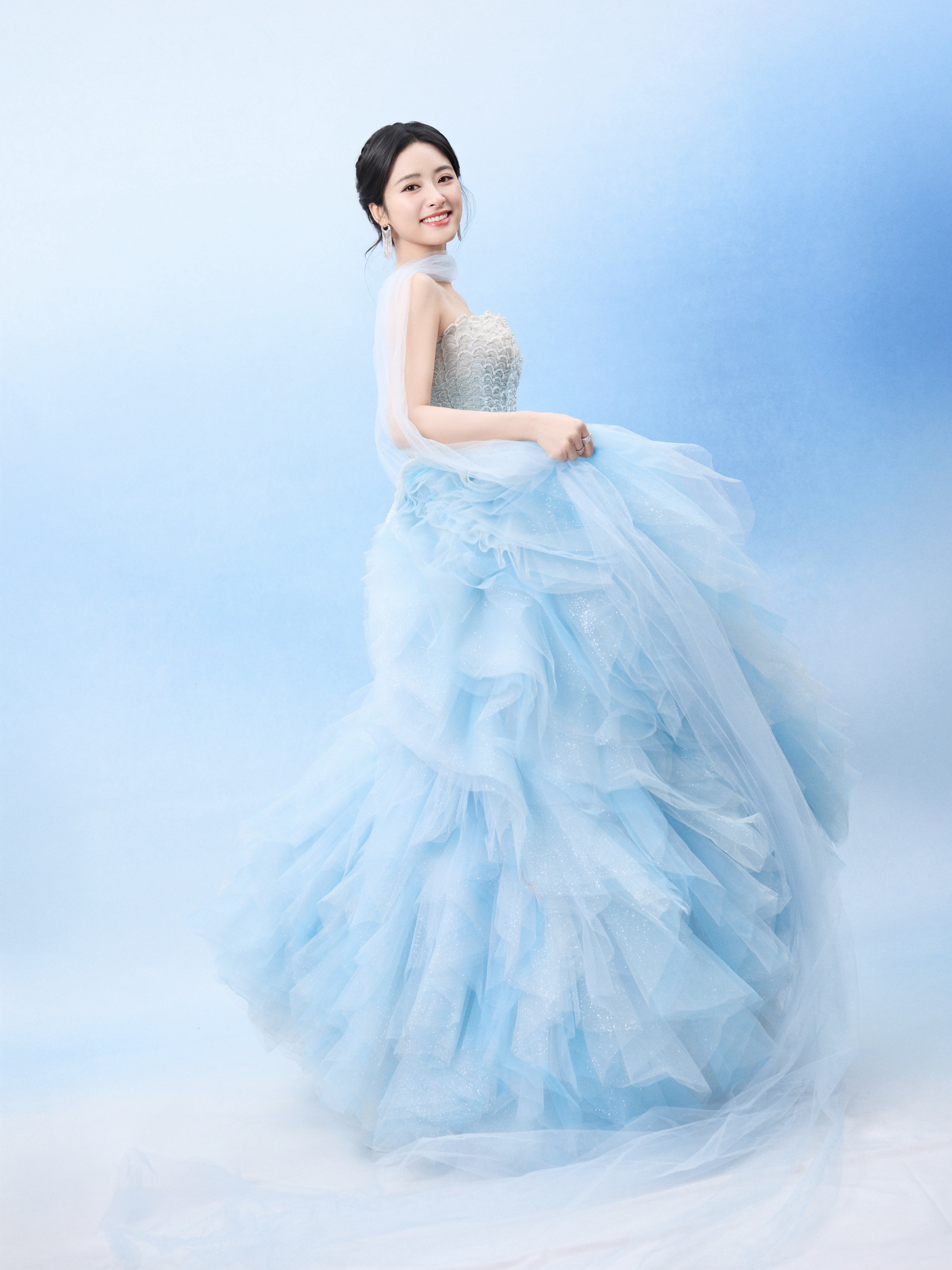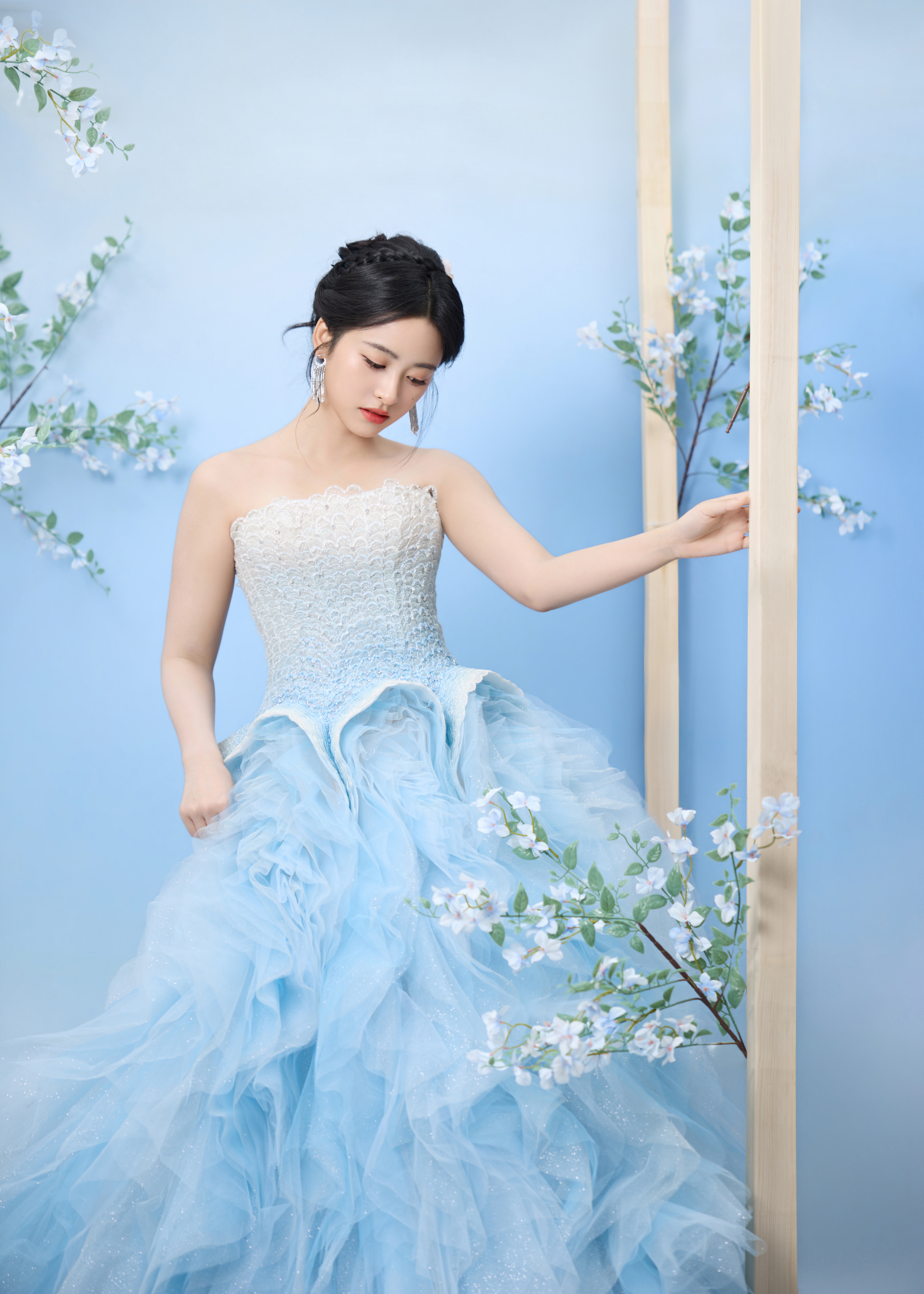 沈月 冰蓝色纱裙似揉碎了的晴空与海浪,抹胸处的碎钻缀着温柔光芒,蓬松裙摆漾开层层浪漫。
