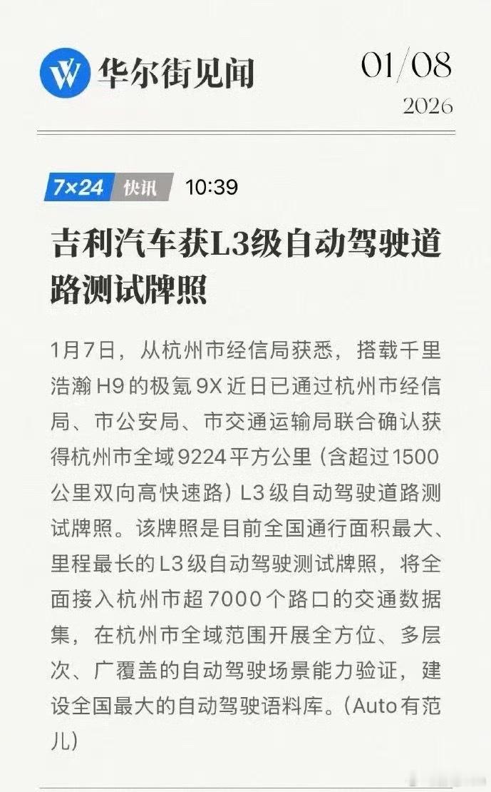 极氪 9X 杭州全域 L3自动驾驶测试牌照,接下来 Robotaxi 也会跟上,吉利的 AI 和具身智能赛道在杭州会全力推进,地方也会大力支持大v聊车吉利新能源汽车
