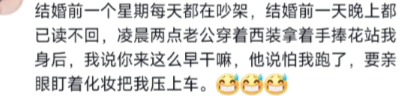 结婚前一个星期每天都在吵架,结婚前一天晚上都已读不回,凌晨两点老公穿着西装拿着手捧花站我身后,我说你来这么早干嘛,他说怕我跑了,要亲眼盯着化妆把我压上车。