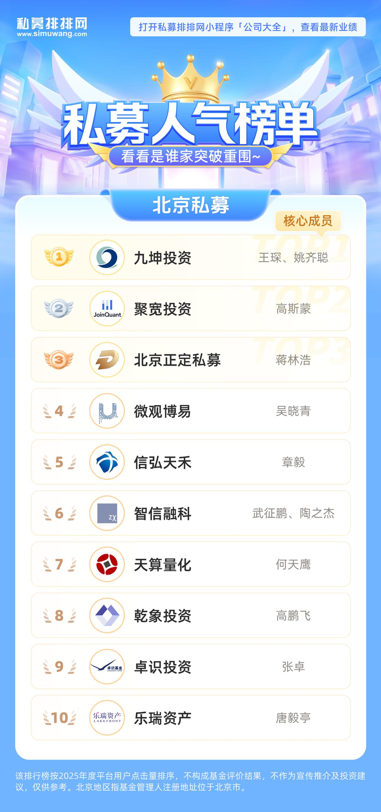 北京私募公司人气排行TOP10(2025年度) 点击查看私募最新业绩: 按私募排排网2025年用户点击量排序,注册地为北京,私募基金公司排名靠前的有九坤投资、微观博易、信弘天禾、智信融科、天算量化、乾象投资、卓识投资、乐瑞资产等。 1、九坤投资 北京私募基金公司排行榜榜首,管理规模在100亿元以上,是国内较早开始从事专业量化交易、高频交易的团队之一。公司秉承数量化交易的投资理念,运用程序化交易技术,为投资者提供产品与服务。 公司旗下有王琛、姚齐聪两位基金经理;管理九坤股票多空配置1号、九坤股票量化优选2号、九坤千舆中证1000指数增强专享7号等598只私募基金。 2、微观博易 管理规模在100亿元以上,是一家以数据和技术为驱动的量化投资公司。从多维海量数据中提取有效信息,凭借低延迟的自动化交易系统和强大的风控与执行标准,通过交易股票、期权、期货、商品、ETF等多种标的,源源不断的从市场中获取Alpha。 基金经理吴晓青;管理微观博易-夏之1期、微观博易-宝途二号B类份额、微观博易-宝途指增七号1期等154只私募基金。 3、信弘天禾 管理规模在100亿元以上,以数理统计、深度学习为理论基础,专注于全球资本市场策略研发,投资范围覆盖股票、期货及其他衍生品、组合基金配置,在北京私募基金公司排名一览表中颇受市场关注。 公司旗下有章毅、张华两位基金经理;管理信弘骐民量化精选6号、信弘启明1号量化、信弘兴泰中证1000一号量化等168只私募基金。 4、智信融科 办公地位于上海,管理规模在10-20亿元,以量化交易为主。公司两位创始人曾在全球知名的对冲基金公司WorldQuant共事,有10多年的量化交易经验。 基金经理武征鹏;管理智信融科量化选股1号B类份额、智信融科CTA十二号B类份额、智信融科多策略八号等23只私募基金。 5、天算量化 管理规模在50-100亿元,是国内较早一批使用人工智能技术,进行股票和期货量化投资的私募基金公司,秉持“构建优势量化交易体系,让利润随时间奔腾”投资理念。 基金经理何天鹰;管理天算中证2000指数增强1号A类份额、天算指增保护专享1号A类份额、天算指数增强6号等135只私募基金,在北京私募基金公司排行榜中排名靠前。