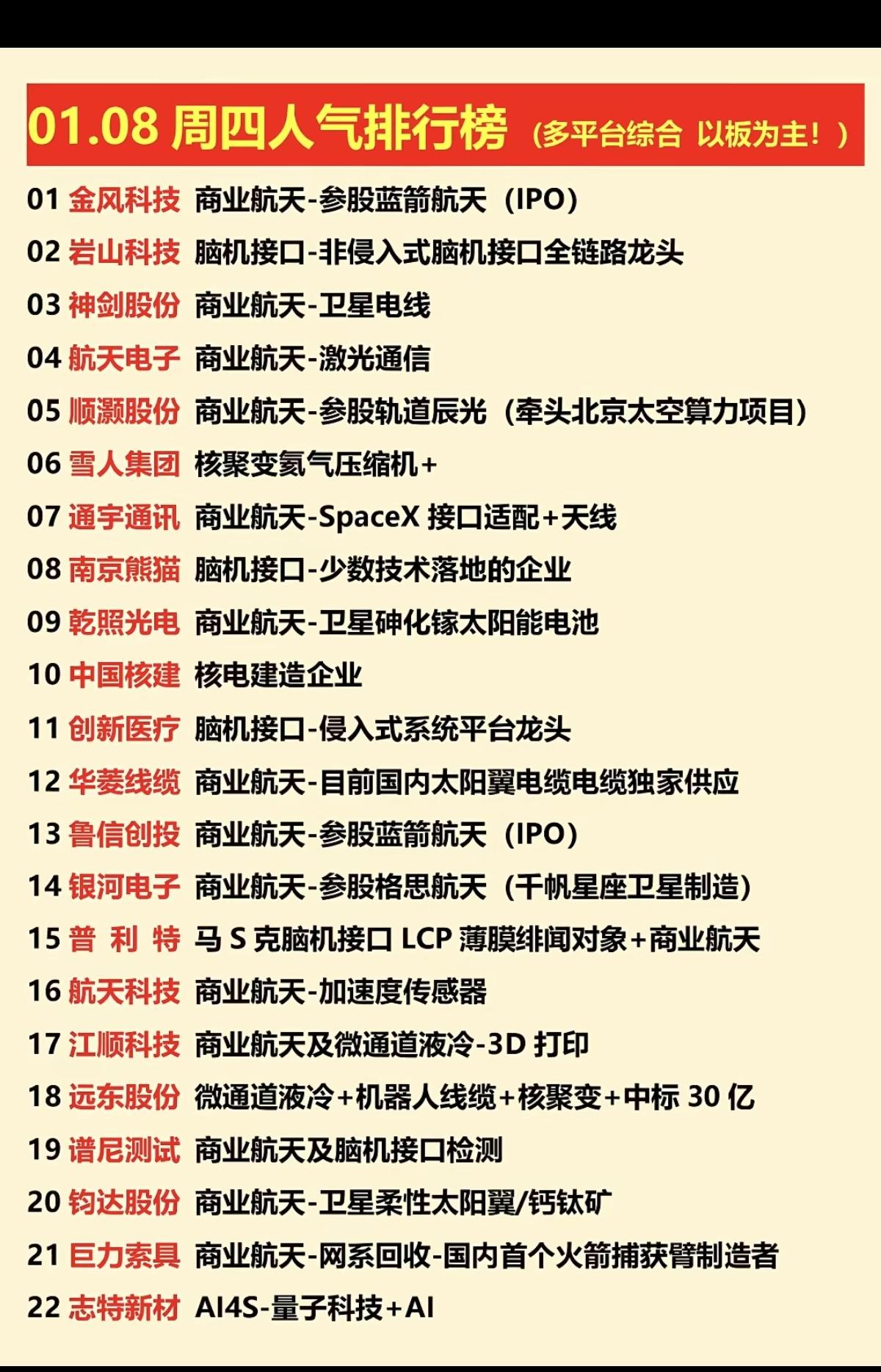 1.08周四 涨停板股票 人气龙虎榜! 商业航天,核聚变,脑机接口,量子科技,航天线缆,卫星天线,火箭