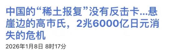 第二轮中日争端打响?韩媒:日本威胁反击,高市早苗只有一张牌? 1月7日商务部官宣的反倾销调查最懂“打七寸”,盯上了日本的进口二氯二氢硅,这东西听着绕口,却是芯片生产的“粮食”,逻辑芯片、存储芯片都得靠它做薄膜沉积。更重要的是数据:2022到2024年,日本这东西往中国卖得越来越多,价格却硬生生跌了31%。 明眼人都知道这是恶意倾销,中国产业被压得喘不过气,这次调查从2024年下半年查到2025年中,一年的调查期足够让日本半导体材料企业坐立难安。 要知道日本在半导体材料领域的优势本就靠技术和价格双杀,现在价格优势被盯上,后续要么补税要么退出市场,而中国占全球芯片产能的比重摆在那,日本企业根本输不起。 比芯片材料打击更致命的,是1月6日落地的军民两用物项禁运。这可不是简单的“断货”,商务部直接划了红线:所有能帮日本提升军力的材料、技术,一概不准出口,连第三方转卖都要追责。 清单里上千项产品全是日本军工的“命门”:镓是宙斯盾雷达的核心,日本40%都从中国买。 锗能造夜视仪和卫星传感器,F-35的电子战系统离不开它;还有钕、镝这些中重稀土,日本高超音速导弹的转向部件、“大鲸”级潜艇的锂电池电机,全得靠它们续命。 2010年钓鱼岛争端时,中国只是限制稀土出口就让日本GDP跌了0.4%,现在野村研究所算过账,要是稀土限制持续一年,日本损失得有2.6万亿日元,GDP直接掉0.43%。 日本从美国买的147架F-35,每架要用417公斤中国稀土,就算美国想帮,也没法凭空变出替代供应链,这等于连美国的军售都被卡了脖子。 面对这波组合拳,日本的反应透着股“色厉内荏”。 外务省亚洲局局长金井正彰跳出来叫屈,说“绝不允许并深表遗憾”,要求中国撤回措施,可转头又补了句“暂不评论对产业的影响”。这话说得心虚——他们自己也清楚,供应链根本经不起查。 高市早苗在新年记者会上还喊着要修订“安保三文件”扩军,结果禁令一落地,日本共产党委员长田村智子直接骂她走“亡国之路”,质问扩军的钱是不是要靠增税和发国债,把民众绑上战车。 自民党内部也炸了锅,有人吐槽“光顾着抱美国大腿,没算过中国的账”,内忧外患之下,高市的政权本就不稳,这下更成了热锅上的蚂蚁。 韩媒盯着的“高市只有一张牌”,说的是日本可能限制对华出口光刻胶,这东西是芯片制造的关键耗材,日本曾在2019年用这招拿捏过韩国。 可这张牌如今早就不是“王牌”,反倒像块烫手山芋。首先中国早有准备,近几年一直在扶持本土光刻胶企业,虽然高端市场还依赖日本,但中低端已经能自给,真断供顶多疼一阵,不会像韩国当年那样直接瘫痪。 更关键的是,日本光刻胶生产也离不开中国的稀土和化工原料,真要撕破脸,中国反手就能掐断它的原材料供应,最后只会两败俱伤。法政大学教授白鸟博说得实在:“高市除了外交谈判别无选择”,所谓的“反击牌”,不过是用来撑场面的虚招。 其实这场争端的根子,是日本加速“再军事化”踩了中国的红线。高市早苗上台后一门心思突破“专守防卫”,要改“安保三文件”、取消武器出口限制,甚至想碰“无核三原则”。 外交部发言人毛宁直接点破,这和历史上的军国主义手法没两样——先渲染“安全威胁”,再把民众绑上扩军战车。中国的反制看似是经济手段,实则是精准打击日本的军事野心:你想造先进武器? 我断你的关键材料;你想靠半导体产业攒军费?我查你的倾销行为。这不是“贸易战”,而是对“战后国际秩序”的捍卫。接下来的局势不难预判:日本大概率会像2010年那样去WTO申诉,但流程至少要走两年,等裁决下来,中国的反制早就见效了。 高市早苗可能会更积极地抱美国大腿,想靠“印太战略”施压,但美国自己的军工供应链都依赖中国,根本帮不上实质忙。至于“狗急跳墙”搞挑衅?日本现在连武器材料都凑不齐,真闹大了只会更被动。 说到底,这场较量再次证明:时代变了,靠耀武扬威、干涉他国内政谋私利的路子走不通了。日本要是真懂“和平发展”,就该先撤回涉台谬论,停下扩军的步子;要是还抱着冷战思维不放,只会被自己的野心拖进死胡同。 高市早苗手里的“牌”其实从来不是光刻胶,而是是否愿意回归和平轨道,可惜从目前的动向看,她似乎还没看懂这张真正的“王牌”。
