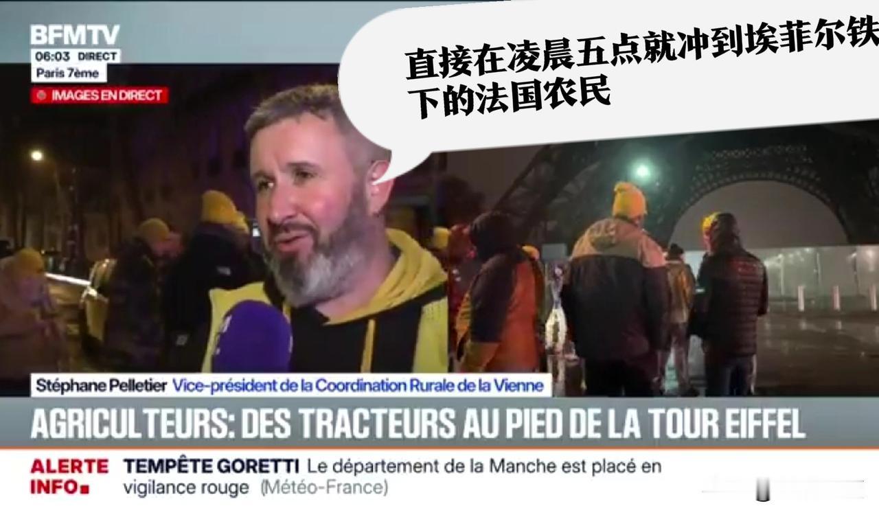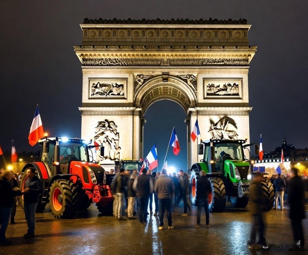 为迎接涌来的法国各地农民,今天早上巴黎警察已经严阵以待。 然后晚上法国农民的拖拉机车队就浩浩荡荡开到埃菲尔铁塔、香榭丽舍大街、凯旋门。 而且他们的增援还在不断进入巴黎市区。看来法国最传统的精神依然存在于法国农村内,法国农民全都不在地里忙碌了,集体出动到巴黎堵路,颇有当年的风骨。