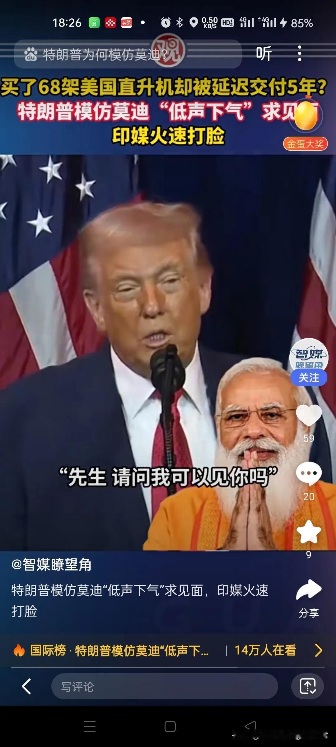 特朗普总统彻底放飞了,前有绑架马杜罗,后有要强占格陵兰岛,再有退出国际体系66个,再有与印度莫迪总理较上了劲了。 他说, 一个莫迪在阿富汗花5万美元建图书馆,就是美国5小时的工作。莫迪总理还不忘在那个联合国吹。我要告诉他的是,我们是好朋友,但低声下气没用,你的关税是我告诉你的。 莫迪总理相当的生气,这个特朗普总统怎么能这样啊,我的印度是30亿美元在阿富汗搞重建。有国会大厦,基础设施建设是说的好好的,怎么可能5万美元? 特朗普一点不理踩莫迪总理的反驳,只让莫迪总理注意一点,他在处理一个个问题,包括委内瑞拉马杜罗,包括购 买俄罗斯石油的国家,包括欧洲人的孤傲和假献殷勤,唐纳德是清醒的。但首要问题是我的朋友莫迪先生,你太,太圆猾了,我防着你! 莫迪总理无可奈何,不知他的朋友特朗普又要对印度搞哪样大突击。 印度莫迪总理忙得很,马克龙的账没算清,特朗普又讹上了,老人家决定闭关理一理这个世界的纷繁复杂[皱眉]