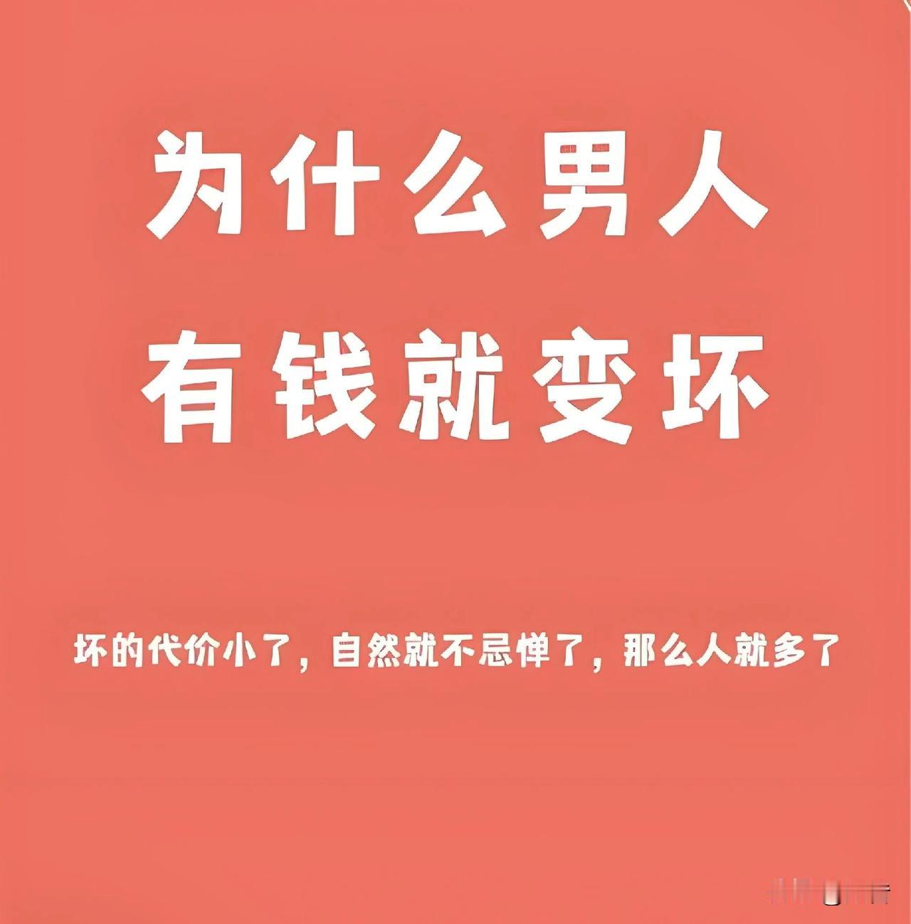 男人有钱就开始变飘! 男人有钱就开始变坏。 男人有钱就开始始乱终弃。 第一类男人:本身就有坏心思,没钱时没有机会,有钱就像打开了堕落的开关。就像我认识的一个朋友一样,从农村搬到大城市和老婆摆摊赚钱后,慢慢的,最后生活就变了味,把原本温馨的家庭搞得稀巴烂。 第二类男人:不管有钱,还是没钱,都能坚守初心不变,不乱搞,不乱花钱。说到底钱只是人格的放大镜,能放大一个人的原有的本性。所以说不能一竿子打翻一船的男人。
