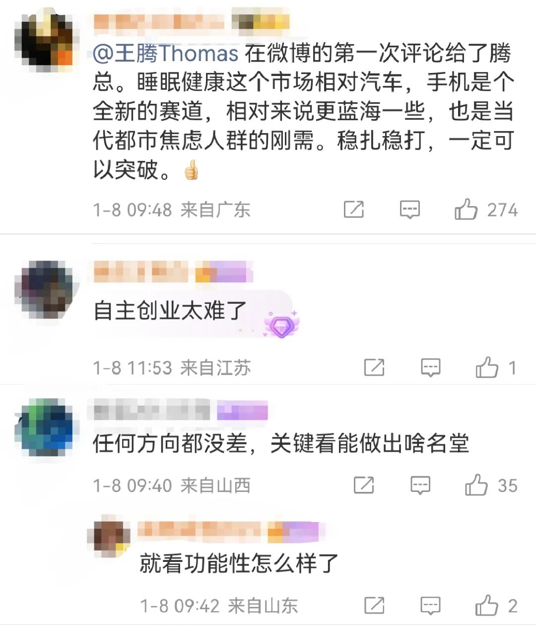 对于王腾的这次创业,外界的看法并不完全一致。有网友表示支持,认为睡眠赛道符合当下健康消费趋势,市场潜力可观;也有人提出疑虑,觉得睡眠产品创新难度大,很难做出真正具有科技差异化的东西;还有部分人持观望态度,认为“方向不是关键,最终要看能做出来什么”。