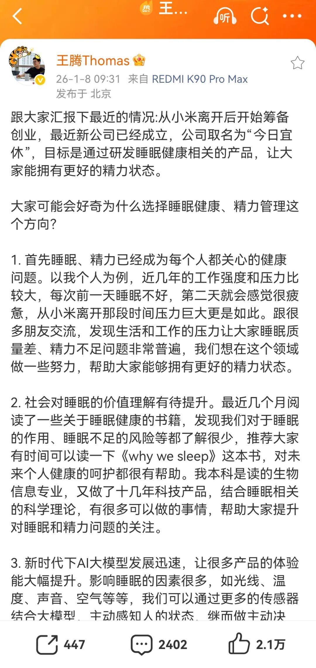 1月8日,小米前高管王腾通过社交平台宣布了自己离开小米后的新动向。他透露,过去一段时间自己一直在筹备创业,如今新公司已经正式成立,取名“今日宜休”。