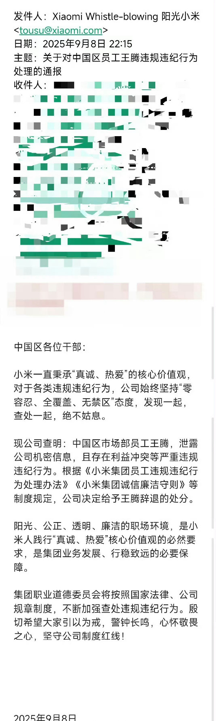 2025年9月,小米集团职业道德委员会的一则内部通报邮件显示,中国区市场部员工王腾因“泄露公司机密信息,且存在利益冲突等严重违规违纪行为”被公司辞退。