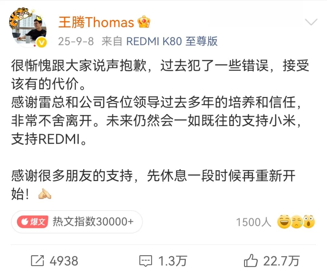 不过,被辞退后的王腾,并没有与小米彻底割席。之后一段时间,王腾仍会在个人账号转发小米手机和汽车的相关消息。因此,外界一度认为双方关系并未彻底破裂。一直以来,王腾的社交平台都有不少小米用户留言,希望他能回归小米。