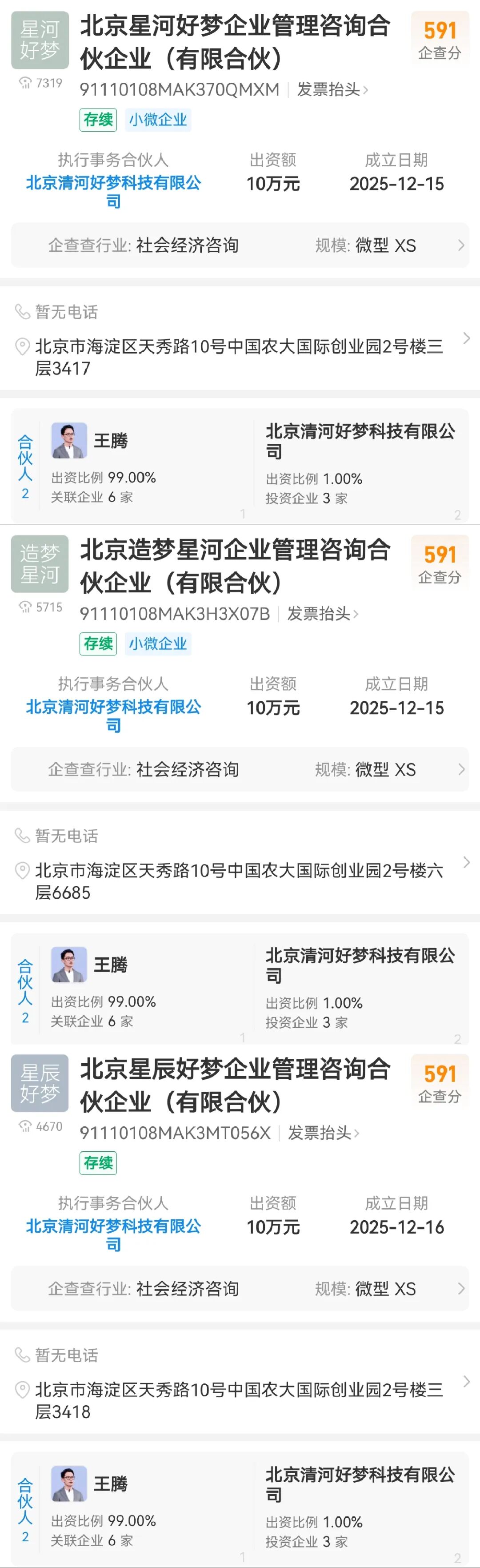 根据企查查公开的信息,王腾新成立的公司全称为“北京今日宜休科技有限责任公司”,注册时间为2026年1月6日,注册资本一百万元,法定代表人正是王腾本人。