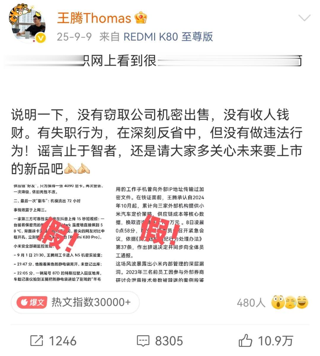 9月9日,面对甚嚣尘上的泄密传闻,王腾亲自出面回应,表示:“没有窃取公司机密出售,没有收人钱财。有失职行为,在深刻反省中,但没有做违法行为!”