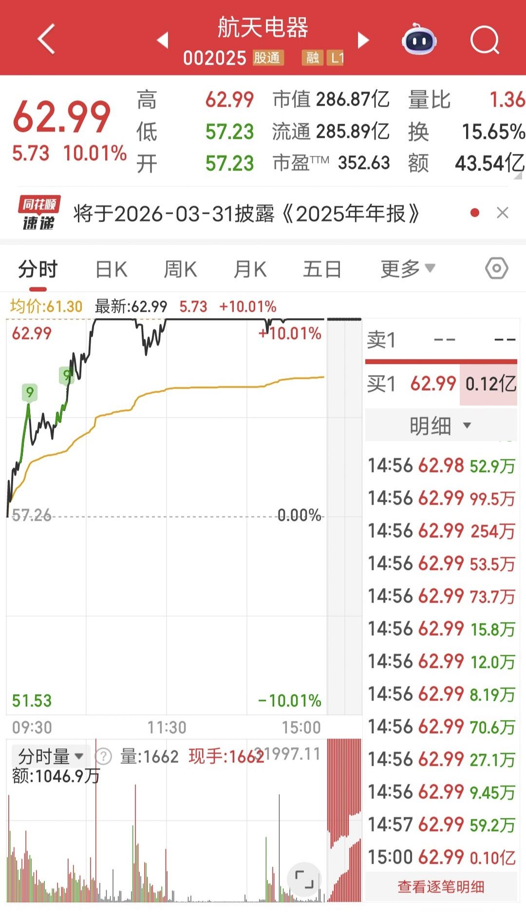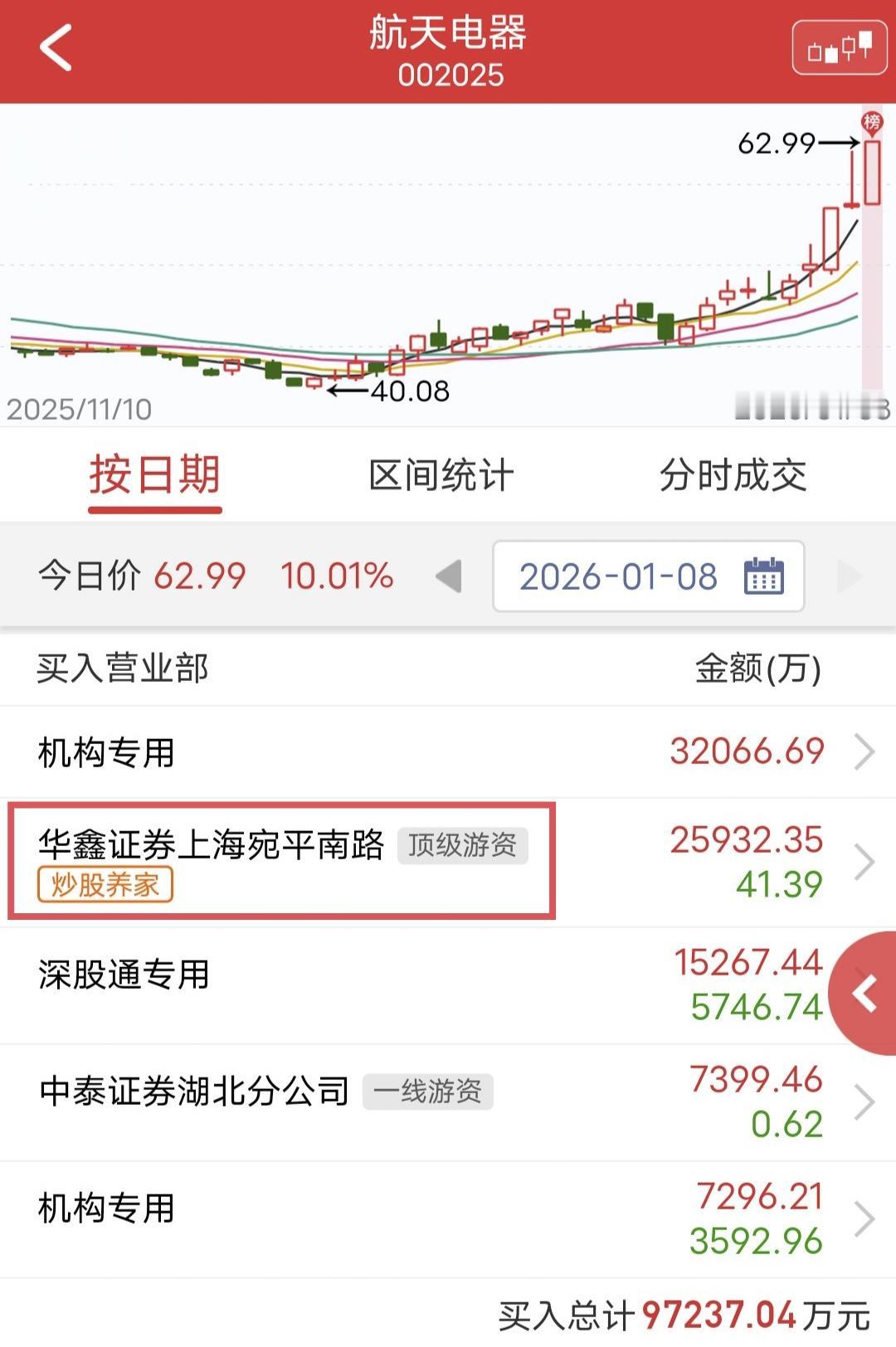 炒股养家爆买2.6亿: 今天航天电器盘中涨停。 盘后龙虎榜数据显示,炒股养家爆买2.6个亿,这应该算是商业航天的低位补涨挖掘了。 不知道现在养家老师的席位还有没有溢价。 游资