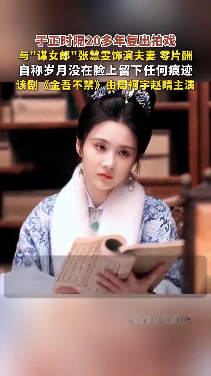 于正时隔20多年复出拍戏,与"谋女郎"张慧雯饰演夫妻零片酬,自称岁月没在脸上留下任何痕迹。 搜狐娱乐。 该剧《金吾不禁》由周柯宇、赵晴主演。近日,一组于正与张慧雯《金吾不禁》的剧照曝光,两人在剧中饰演一对夫妻引起热议。这也是于正时隔20多年后复出拍戏,在剧中饰演定北将军沈杰。 早前于正曾发文分享为《金吾不禁》首次试妆感想,称:"距离上一次演戏已过去20多年,可岁月没在我脸上留下任何痕迹。”于正还坦言接下这个角色的两大原因:一是想在自己主创的重要作品里留下形象,二是希望能托举新人演员。