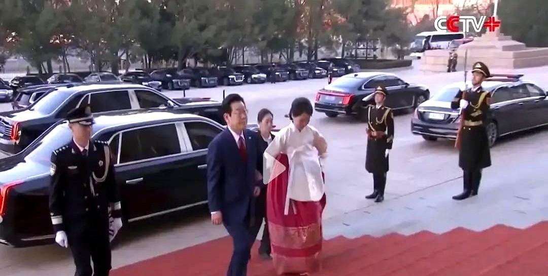 韩国第一夫人金惠景,有人笑她太讲究。 北京人民大会堂台阶上,那身正红色金线韩服,裙摆一动,稳了! 旁边李在明总统的红领带,懂了,这是夫妻俩的默契暗号! 前一晚晚宴,她还穿了件靛蓝色韩服,象征和平。 听说这两套全是首尔手工大师一针一线染的,光染布就得一周。 刚到北京时,那身宝蓝色大衣也超飒,完全是两种风格。 所以啊,有人嫌她用力过猛,我倒觉得这“讲究”刚刚好。衣服会说话,她这意思,递达到了。