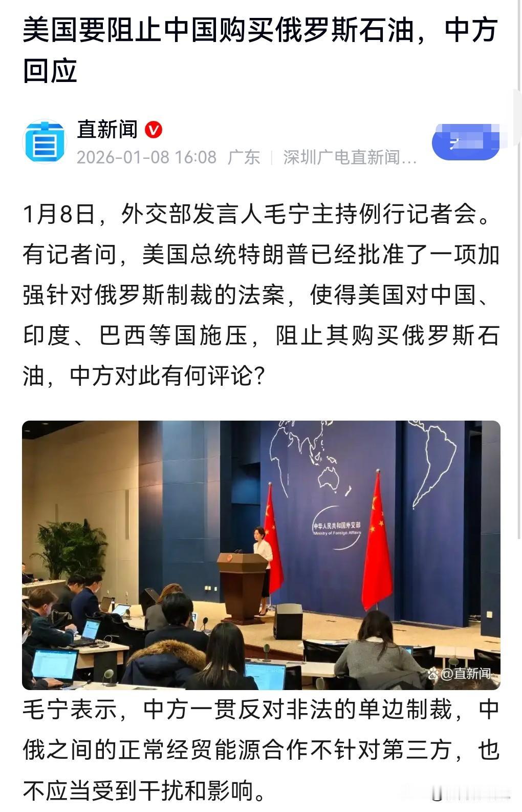 美国实在是太丧心病狂了,一下制裁这个国家,一下制裁那个国家,好像全球他是老大一样,动不动就欺负别的国家。 1月8日我在网上看到这么个事,美要阻止中国购买俄石油。 美国真的是手太长了,管太宽了。 我们买俄罗斯的石油关美国什么事,美国这是典型的小人心态,嫉妒心太强。