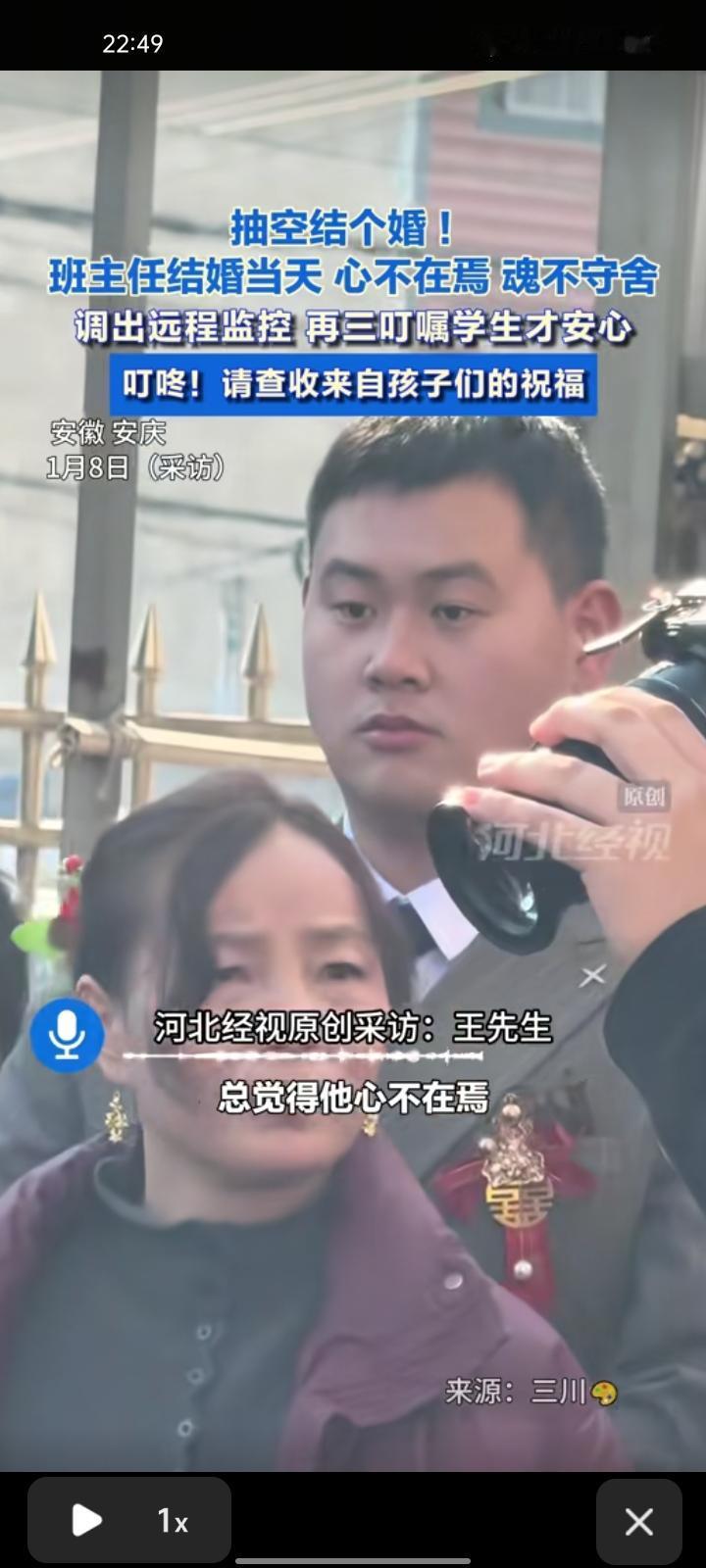 1月7日,安徽安庆。网友晒视频表示,班主任结婚当天总觉得心不在焉,魂不守舍,没想到他拿出手机给班级打视频电话,感觉这婚真是抽空结的,因为临近期末,他时刻叮嘱孩子们好好上课复习,那一刻确实觉得好笑,同时赶到了作为一名人民教师的责任心,老师的付出也得到了孩子们真情的反馈与祝福。
