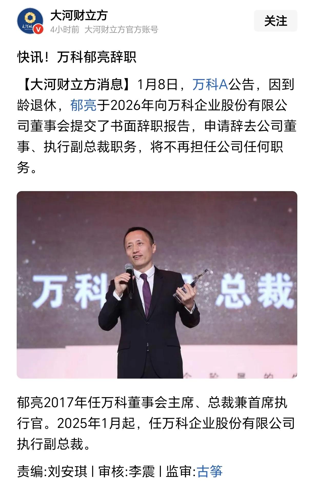 万科郁亮不出意外终于辞职了,理由是到龄退休。 现在万科的债务危机,很大程度上就是在他17年开始领导万科时期埋下的,现在万科这艘船要沉了、他就说要退休跳船离开了。 郁亮是1965年出生,到今年刚好60岁,如果是普通人确实可以退休离职,但国内的很多企业家是没有到龄退休这样的辞职理由,大多数都恨不得大权在握到生命最后一刻。 辞职退休不是平安落地,万科的问题必须追查到底,深圳地铁投入的钱不明不白的亏损那么多,要有交代的。 万科资金困局 万科 万科债务 万科企业危机 a股万科 万科:郁亮申请辞去公司董事会主席 万科资金链