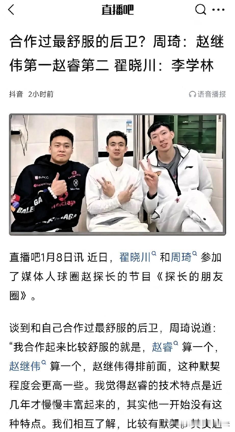 周琦谈生涯合作最舒服后卫,赵继伟第一,赵睿第二,并没提徐杰。匪夷所思,毕竟广东时期,俩个人曾搭档过一段时间,在国家队时期也有过合作,让我不由得想起徐杰前不久那次意外受伤,周琦爬起来就快速离开事发现场,有些奇怪。其实,哈登保罗和周琦都合作过,为啥选择赵继伟和赵睿两个东北老乡,一个是从小到大的兄弟,一个是北京和男篮的哥们儿,自然入选