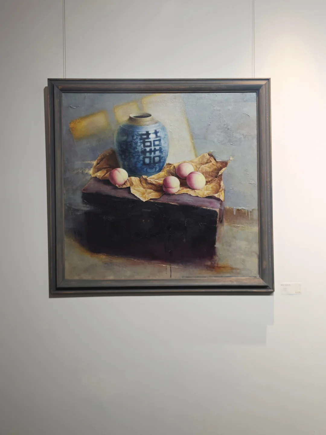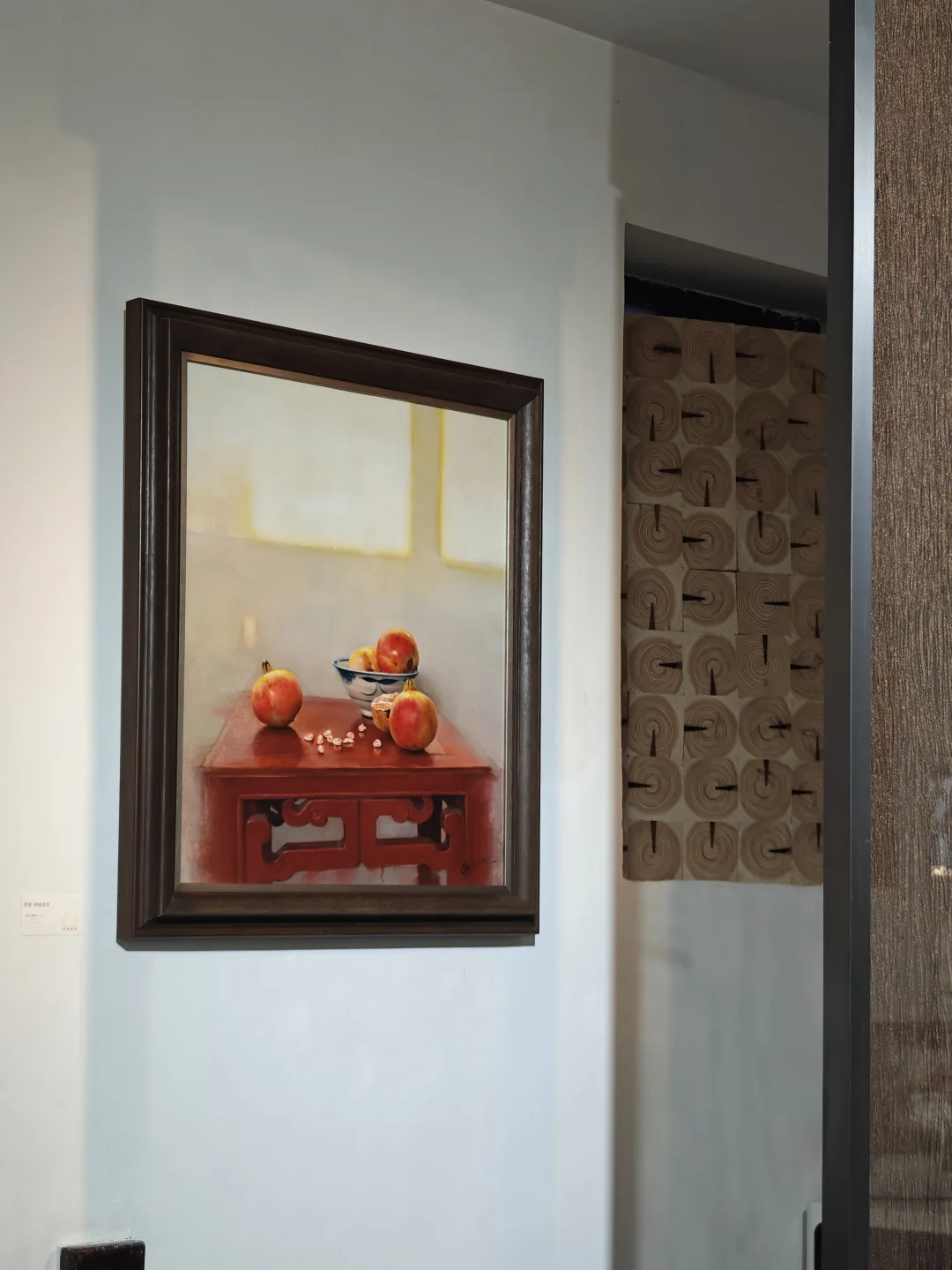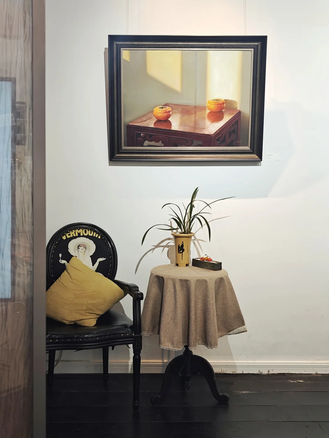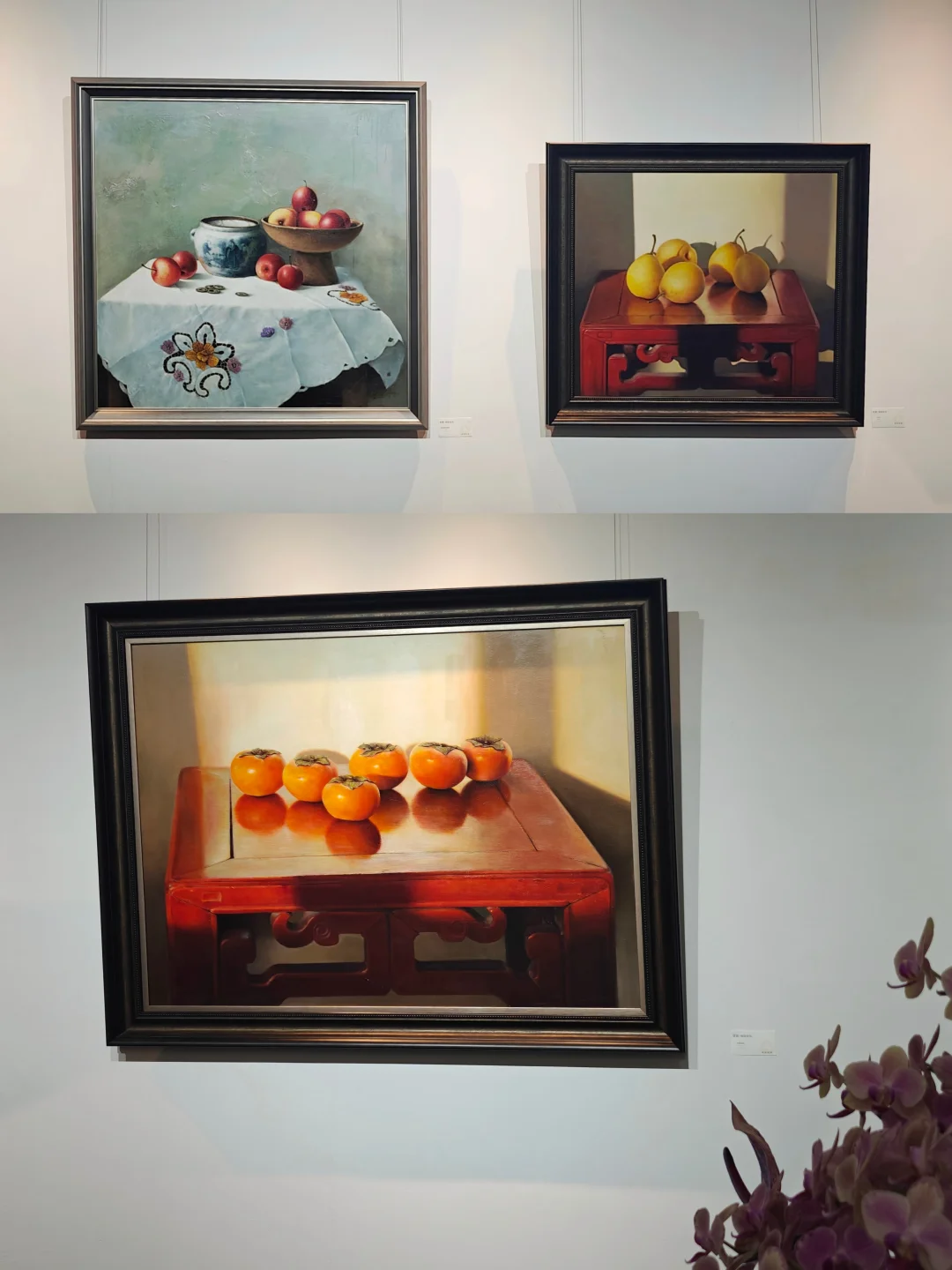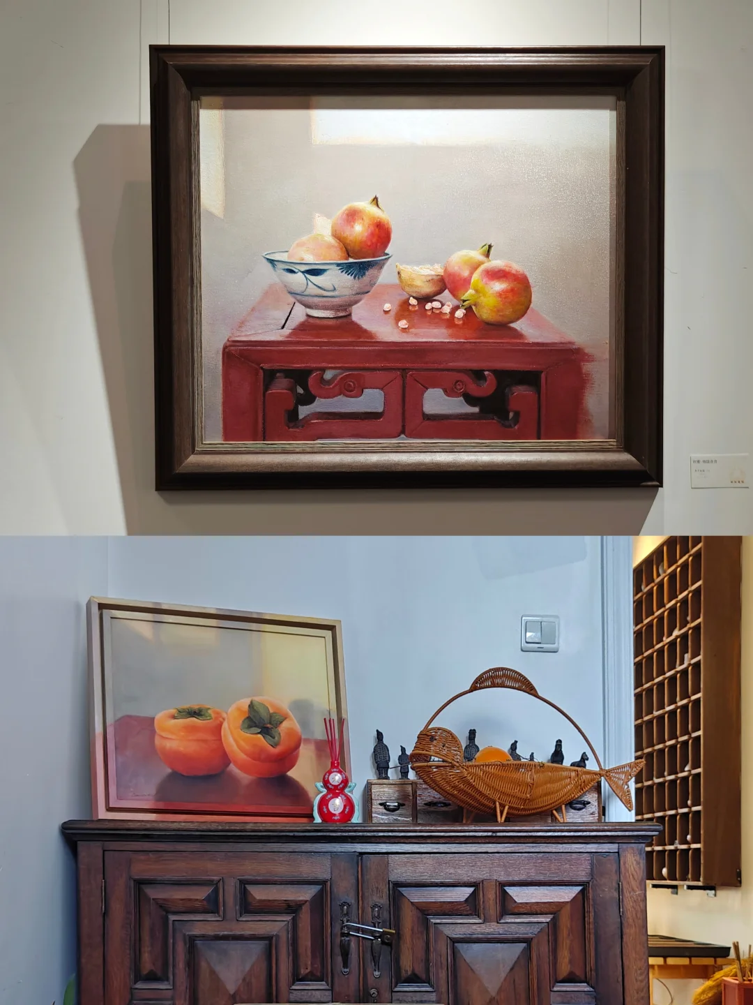🍁象征“事事如意”的柿子,“长寿安康”的🍑,“大吉大利”的🍊,“多子多福”的莲蓬,常常出现在国画中,艺术家用西方油彩将其描绘,并置入带有日常感的怀旧场景中,安静而质朴,让人回忆起童年上长辈家串门的场景,仿如一场关于物候与祈愿的视觉诗篇。