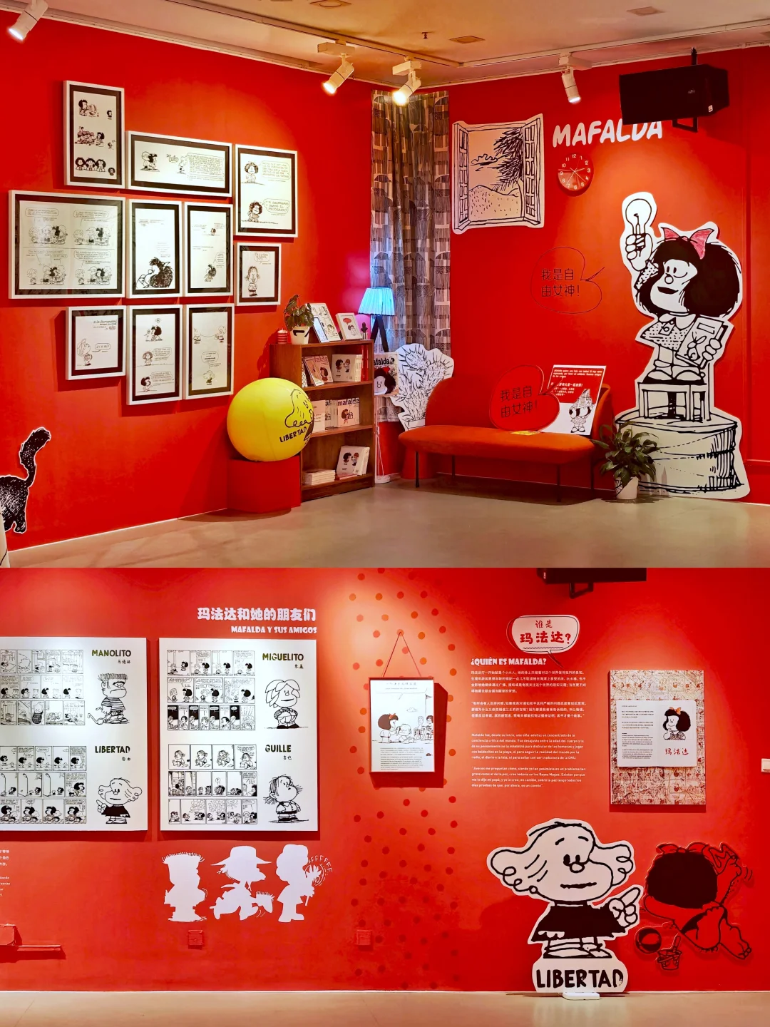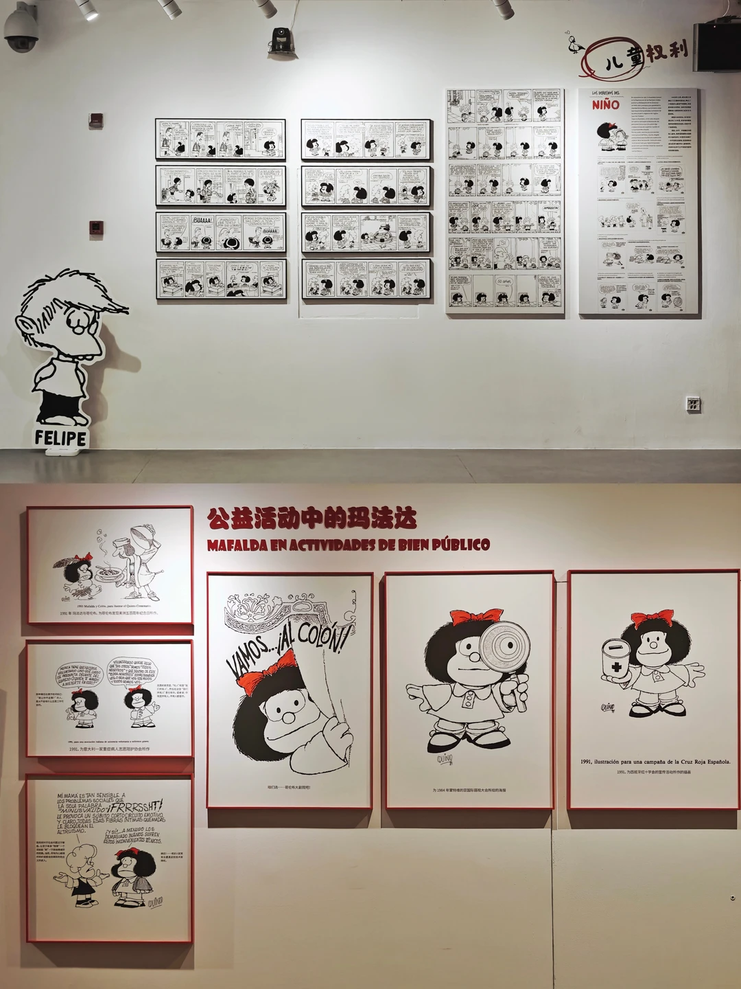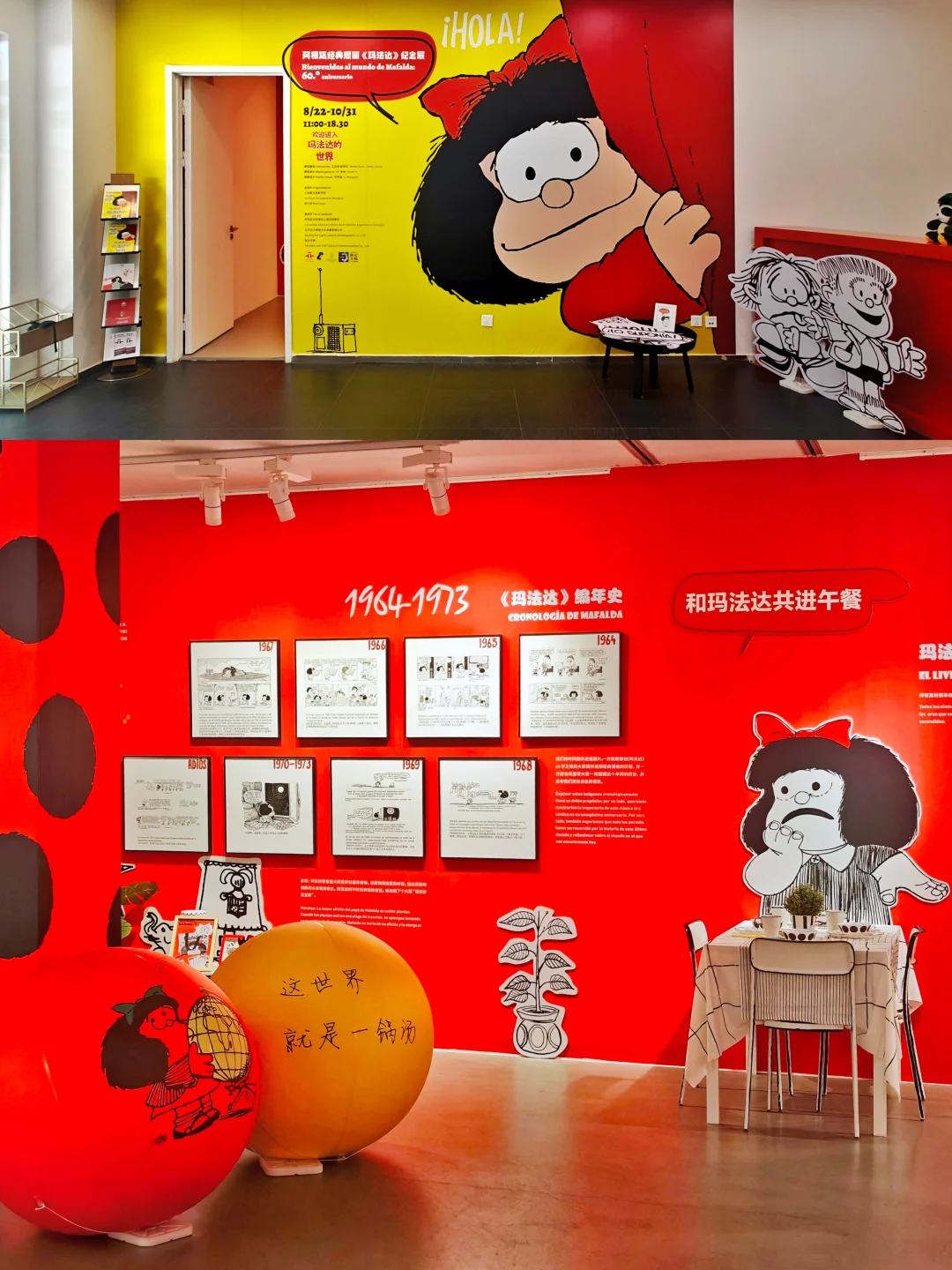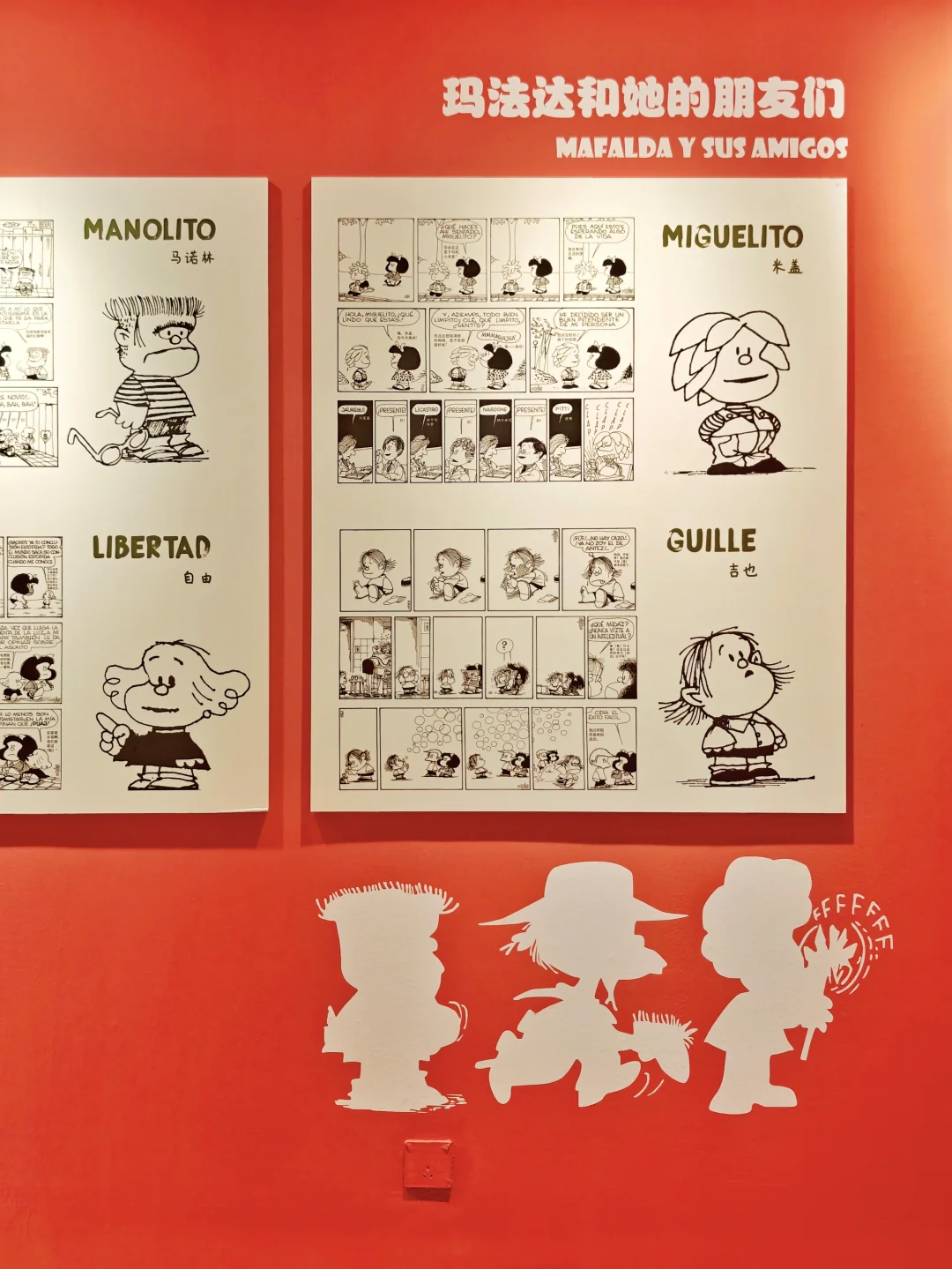展览不仅展出《玛法达》经典漫画原作,更打造1:1等身角色展板(玛法达及好友苏Susanita、Manolito、Felipe等),复刻她的卧室与餐厅场景——仿佛穿越进漫画里的日常,复古又治愈。