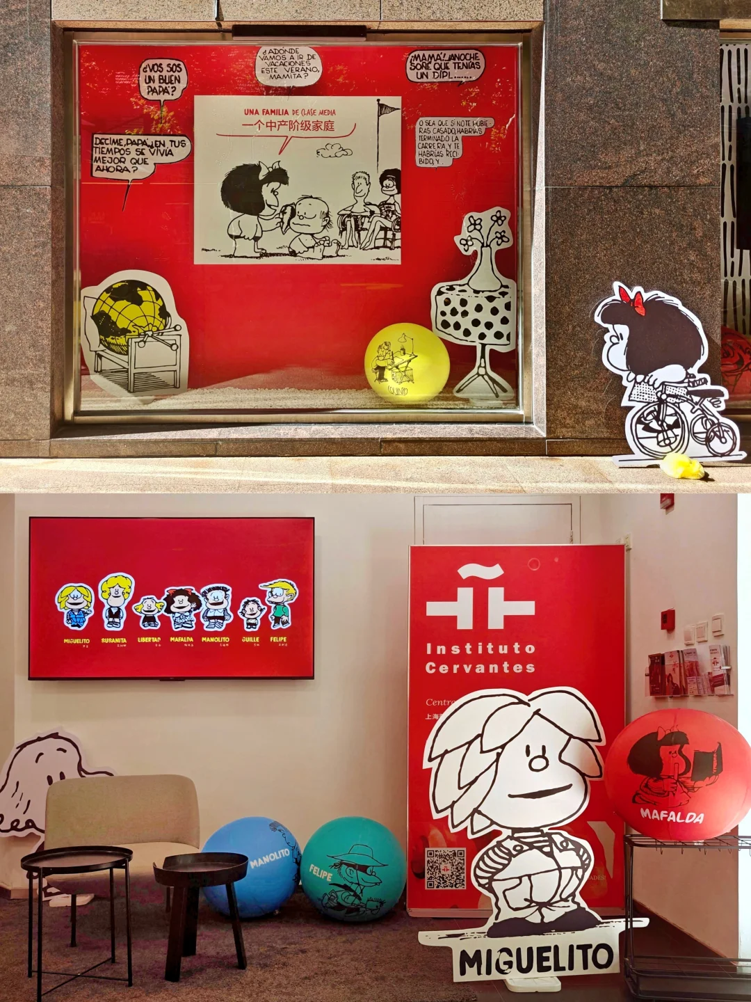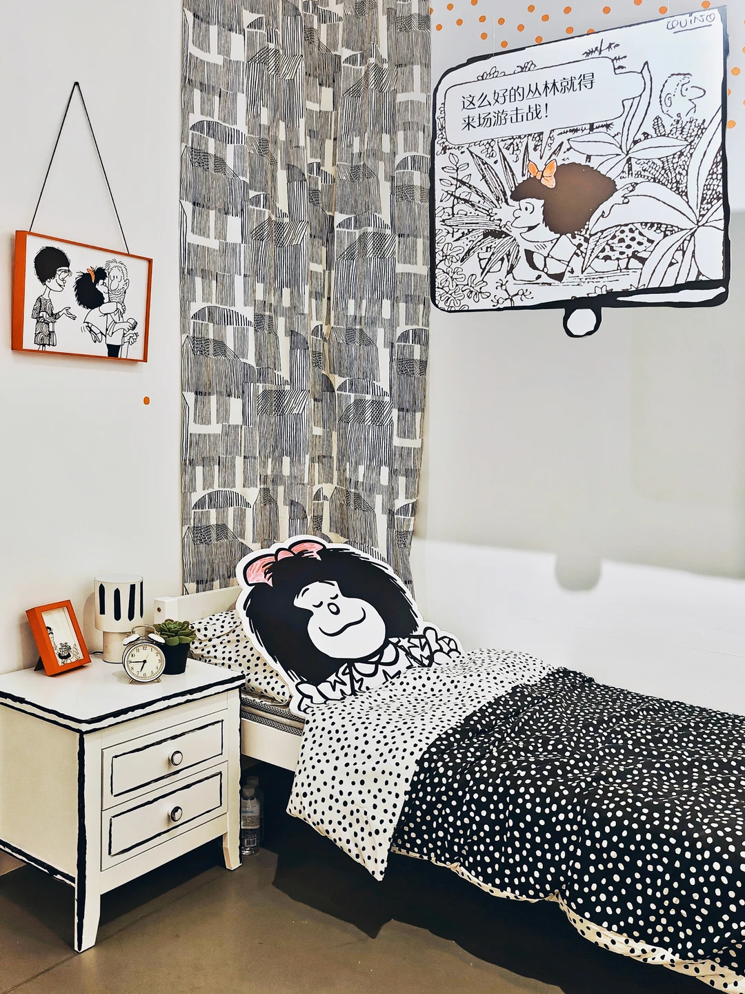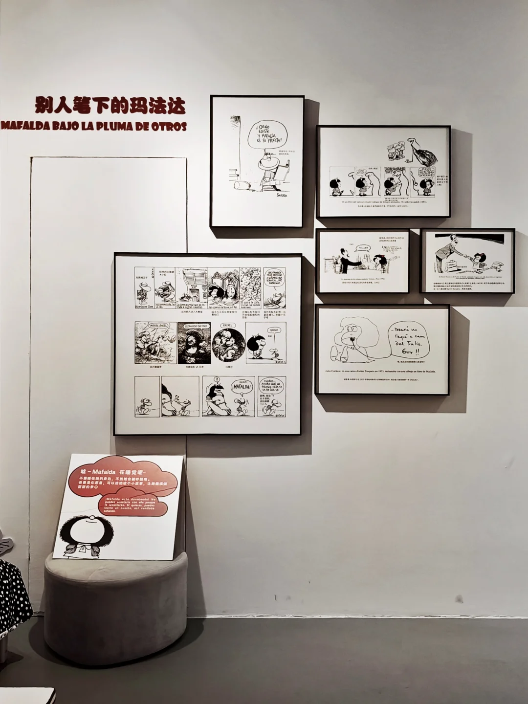 展览不仅展出《玛法达》经典漫画原作,更打造1:1等身角色展板(玛法达及好友苏Susanita、Manolito、Felipe等),复刻她的卧室与餐厅场景——仿佛穿越进漫画里的日常,复古又治愈。
